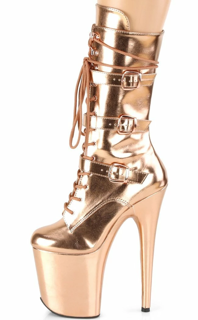 8″ (200mm) heel, 4″ (100mm) platform lace-up front mid calf boot with buckles, inner zip closure.