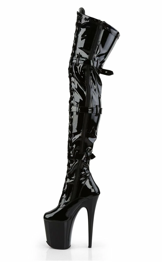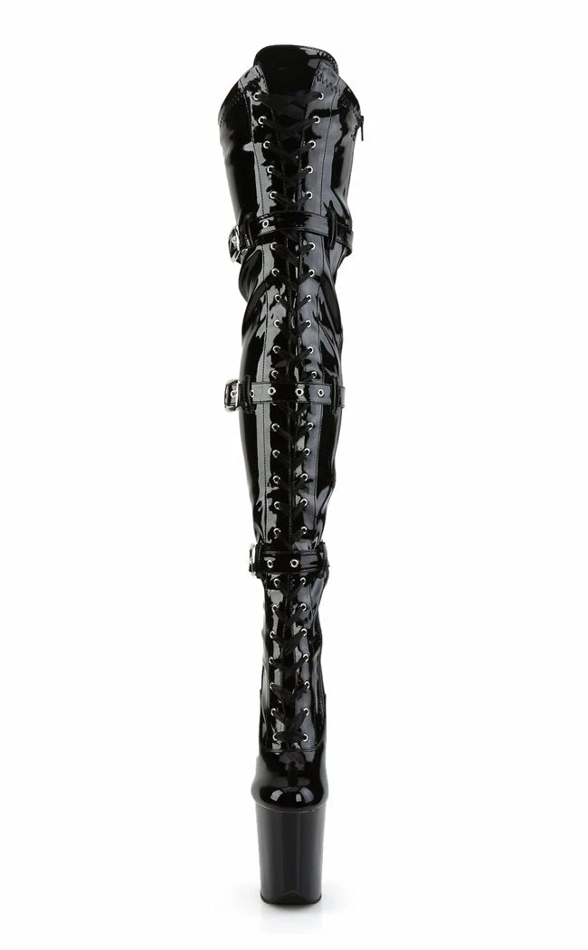 8″ Heel, 4″ PF Stretch Thigh Boot W/Buckled Straps, Side Zip