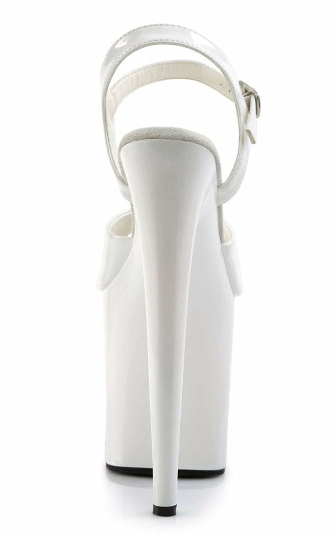 White patentΒ pole-dancing shoesΒ with a sky-high 8-inch stiletto heel and 4-inch platform.