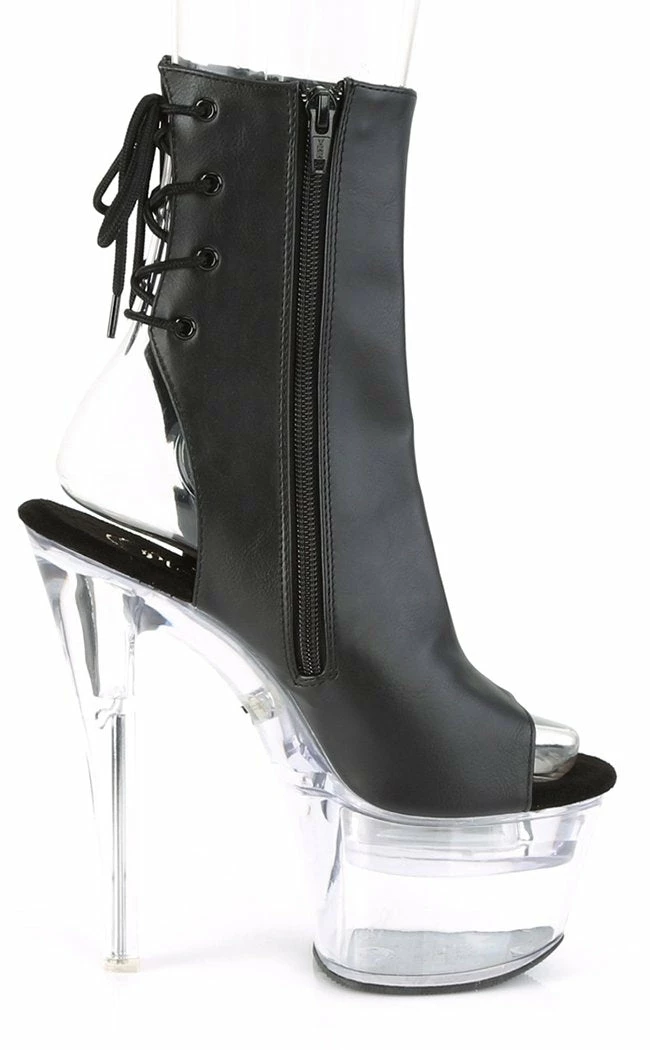 7″ (178mm) heel, 2 3/4″ (70mm) platform USB chargeable LED light-up open toe/ heel lace-up back ankle boot w/ multiple static/ changing color options & light settings