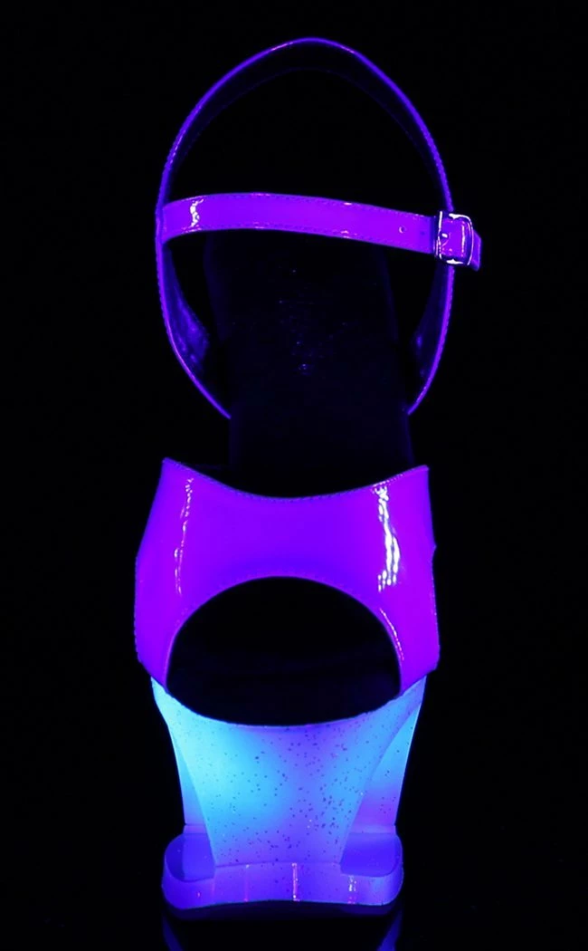 7″ (178mm) heel, 2 3/4″ (70mm) cut-out platform ankle strap sandal featuring blacklight reactive swimming mermaid inside the platform cutout and mini iridescent glitters on the entire platform bottom.