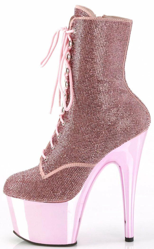 These babies are totally extra!Β The upper is totally embellished with baby pink rhinestones that glitter and shine with the matching baby pink mirror chrome platform and heel.Β These boots secure with a lace up front and side zip.