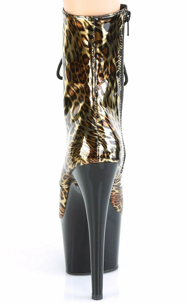 7″ (178mm) heel, 2 3/4″ (70mm) platform lace-up ankle boot, inside zip closure