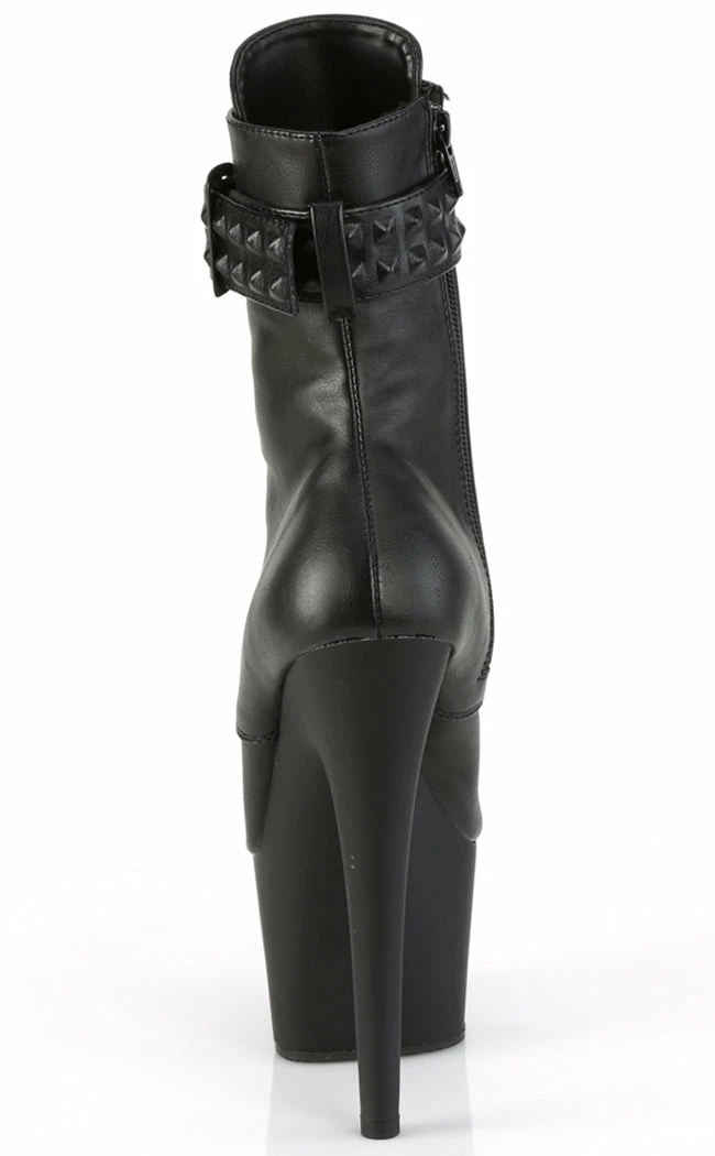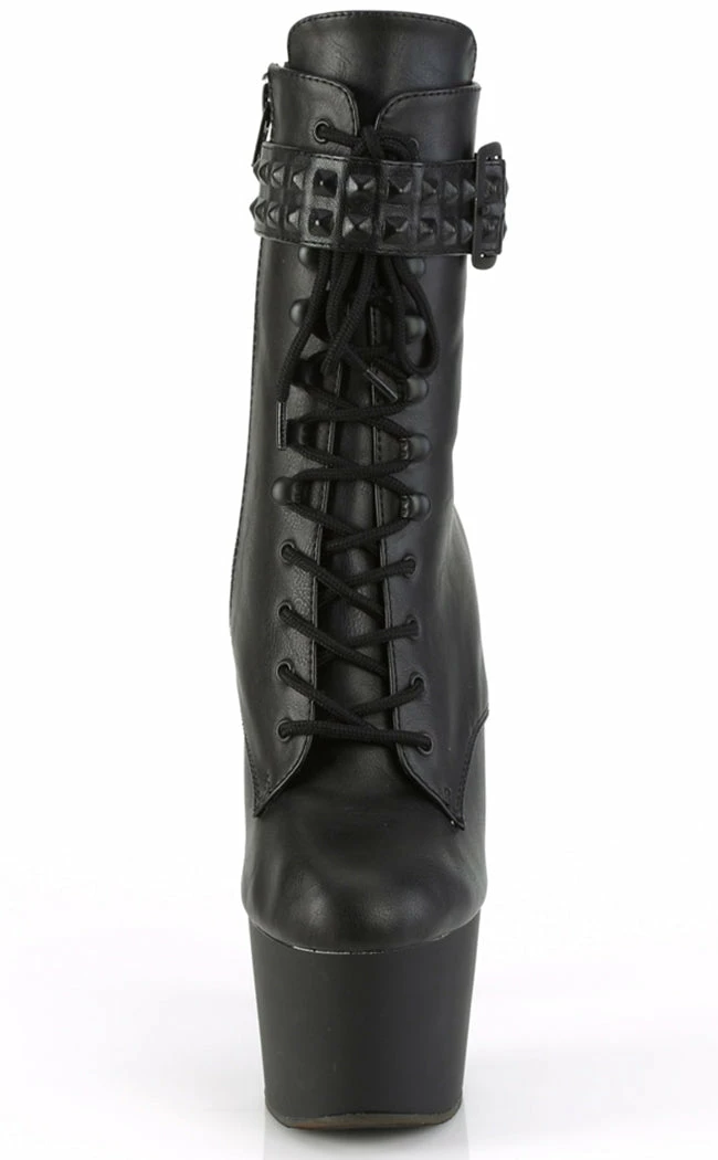 Go punk with the ADORE-1020STR boots! These heels are made with luxe faux leather and feature a studded ankle strap. They secure with a lace-up and inner zip.