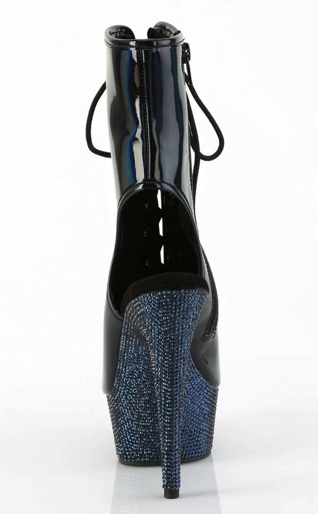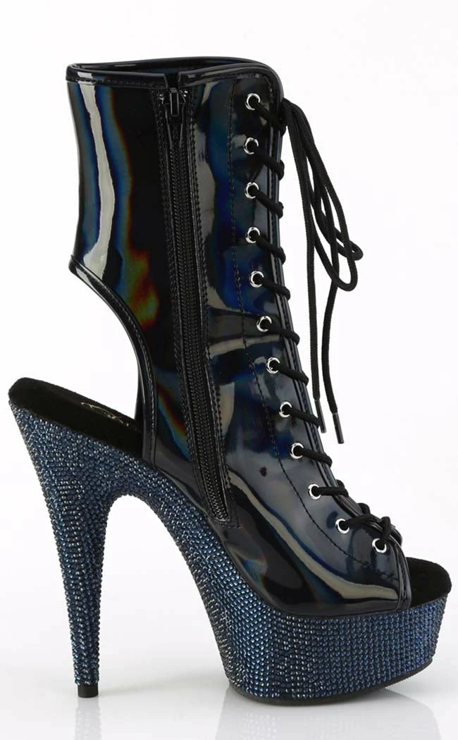 Time for a little glitter and shine! The luxurious BEJEWELLED-1016-6 peep-toe boots feature a cutout heel and a platform totally encrusted withΒ midnight black rhinestones, topped with black holo vinyl. The boots lace up and secure with an inner zip for easy on/off.