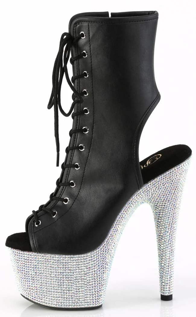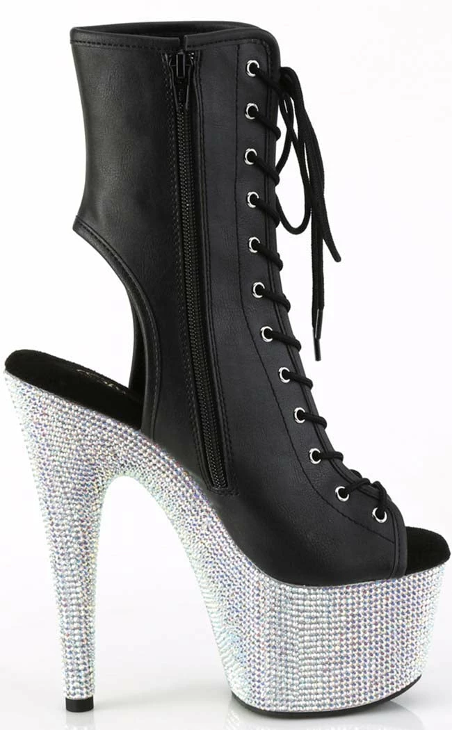 Time for a little glitter and shine! The luxurious BEJEWELLED-1016-7 peep-toe boots feature a cutout heel and a platform totally encrusted with silver AB rhinestones, topped with black vegan leather. The boots lace up and secure with an inner zip for easy on/off.