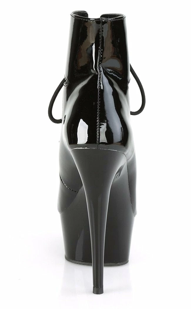 6″” (152mm) heel, 1 3/4″” (45mm) platform cutout ankle bootie pump featuring lace-up ties at front