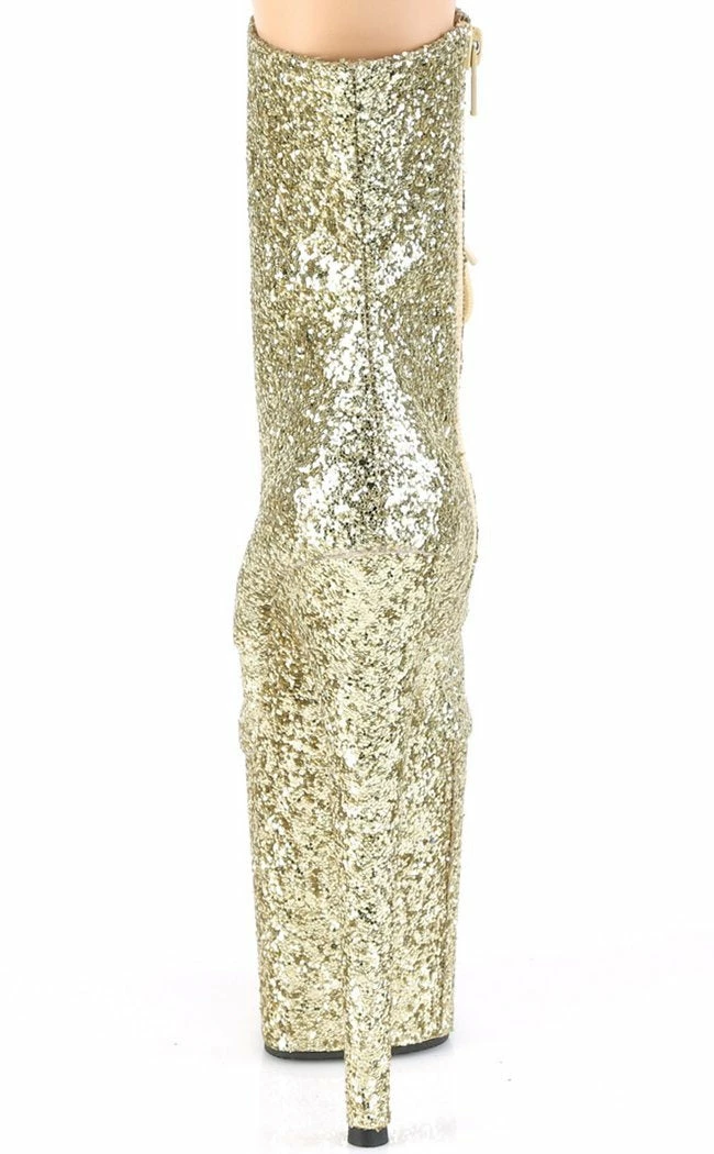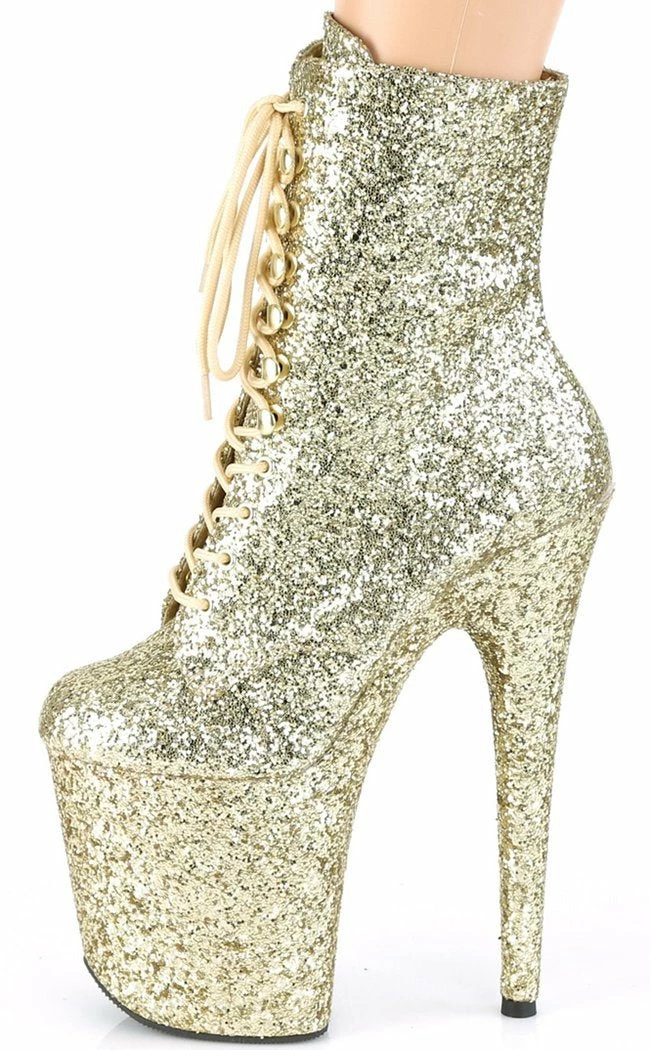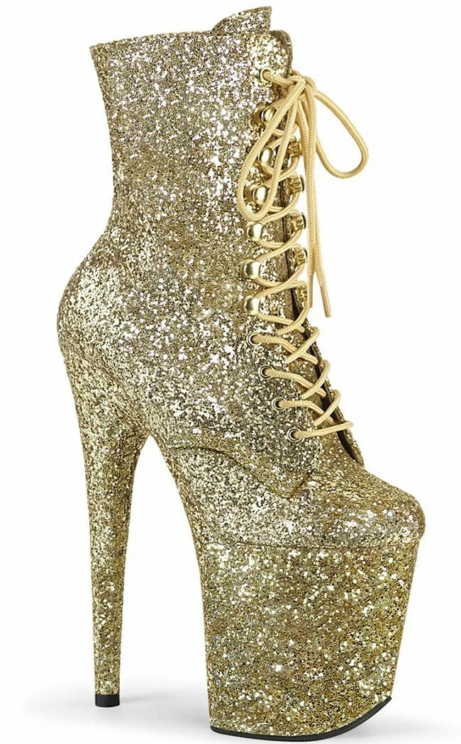 8″ (200mm) Heel, 4″ (100mm) Platform Lace-Up Front Glitter Ankle Boot Featuring Fully Wrapped Platform Bottom, Inside Zip Closure