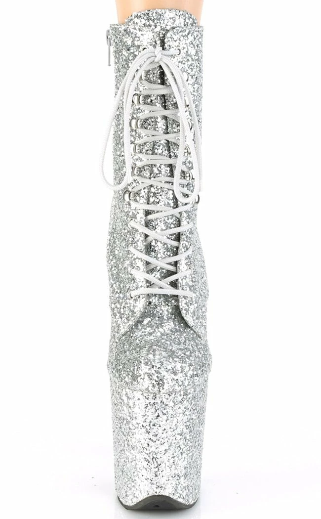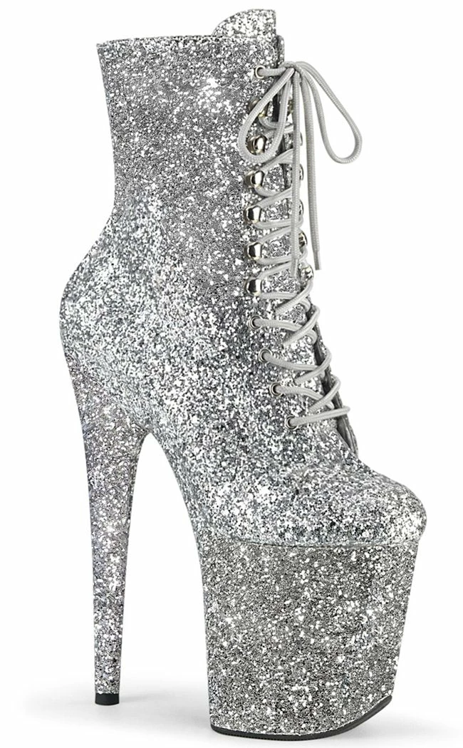 8″ (200mm) Heel, 4″ (100mm) Platform Lace-Up Front Glitter Ankle Boot Featuring Fully Wrapped Platform Bottom, Inside Zip Closure