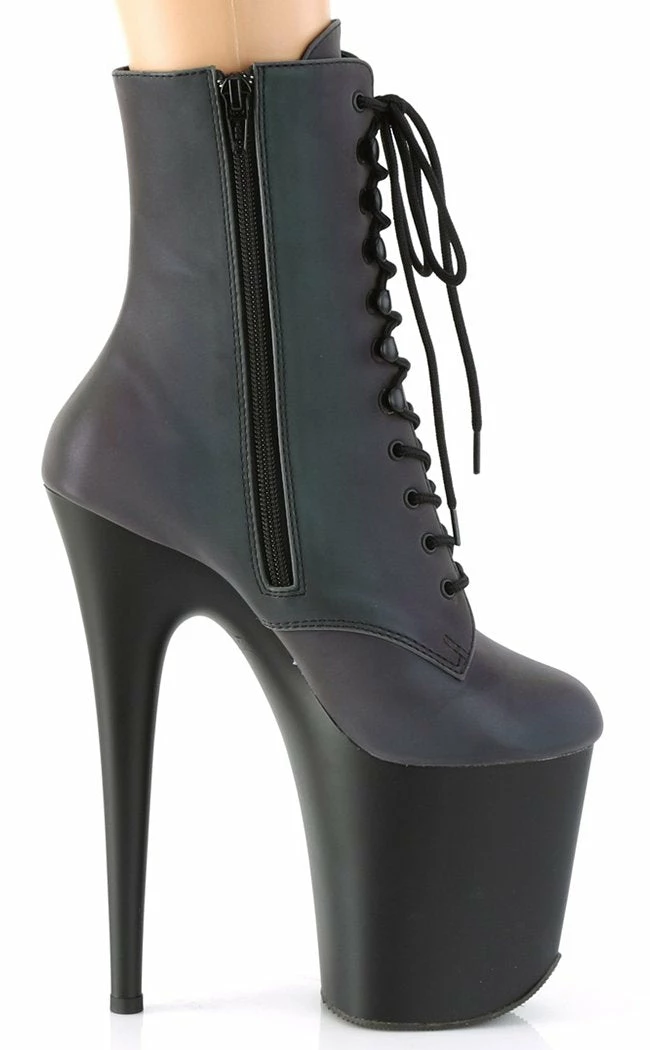 These babies glow under black light!Β The upper is a UV reactive green multi, the heel and platform a matte black.Β The boots fasten with a lace up and inner zip.