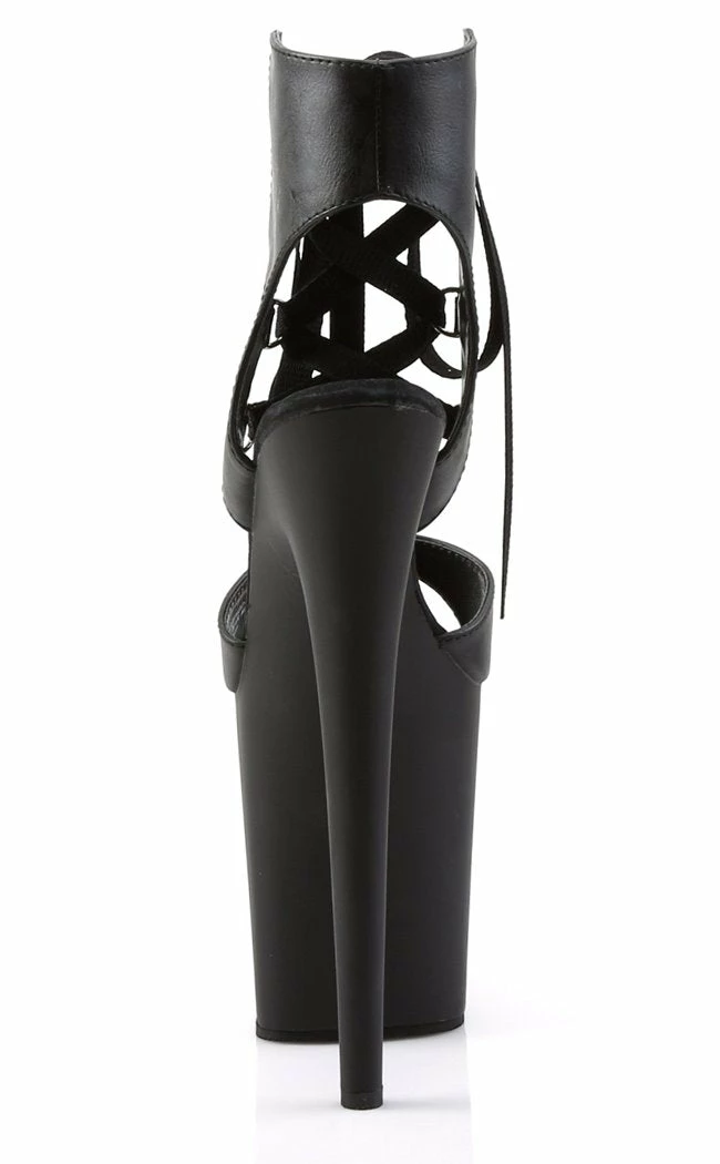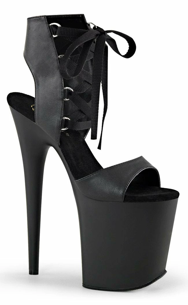 A bootie sandal with an 8″ Heel and a 4″ platform.Β A ribbon lace up front and peep toe are super cute, along with a cut out heel.
