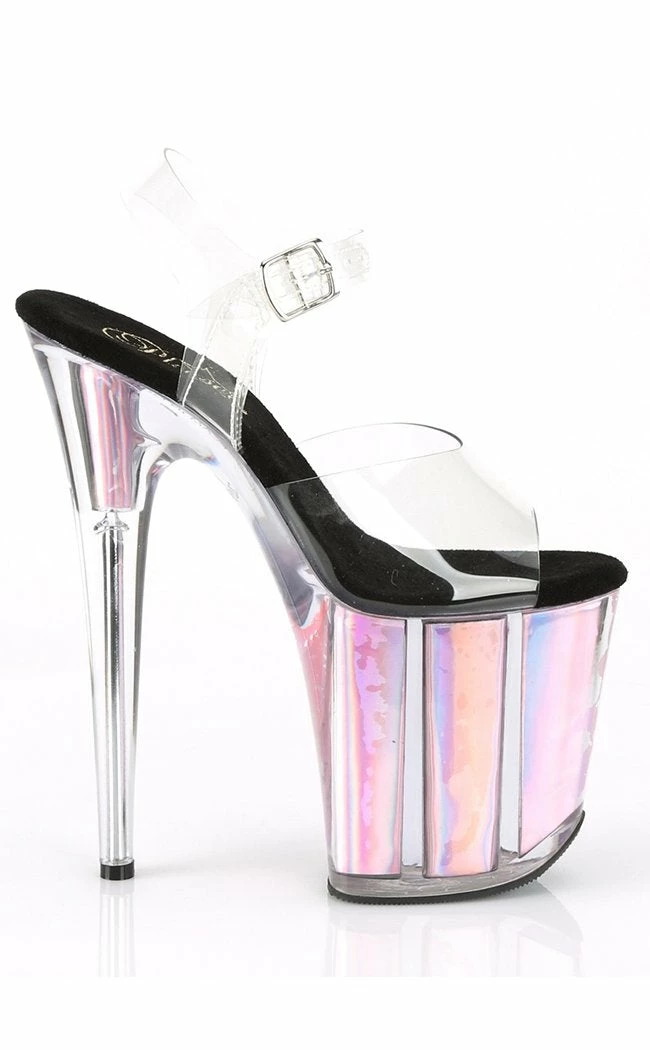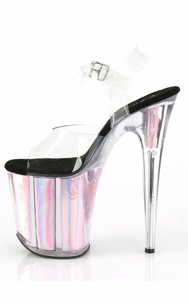 8″ (203mm) Heel, 4″ (102mm) Platform Ankle Strap Sandal FeaturingΒ Holographic Inserts in the Platform Bottoms