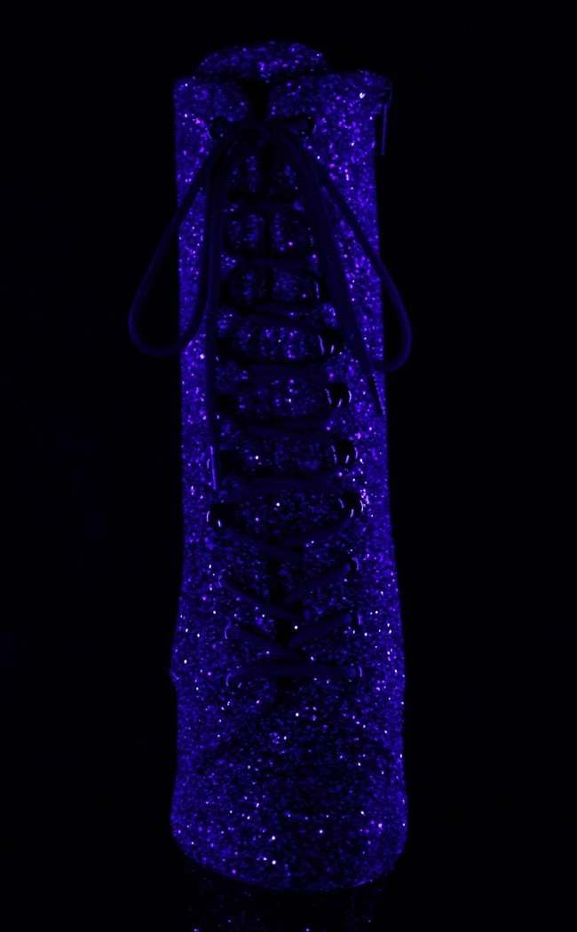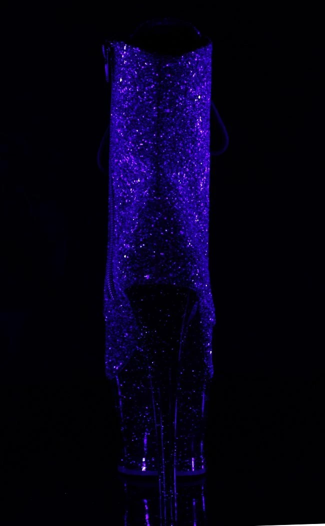7″ (178mm) heel, 2 3/4″ (70mm) cut-out platform lace-up front ankle boot featuring blacklight reactive swimming mermaid inside the platform cutout and mini iridescent glitters on the entire platform bottom, full inside zip closure.