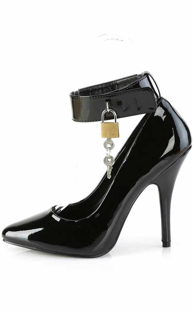 Lock it in with the SEDUCE-432 heels! These sexy statements feature a black patent upper with a wide ankle band with a lockable padlock.