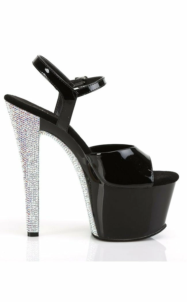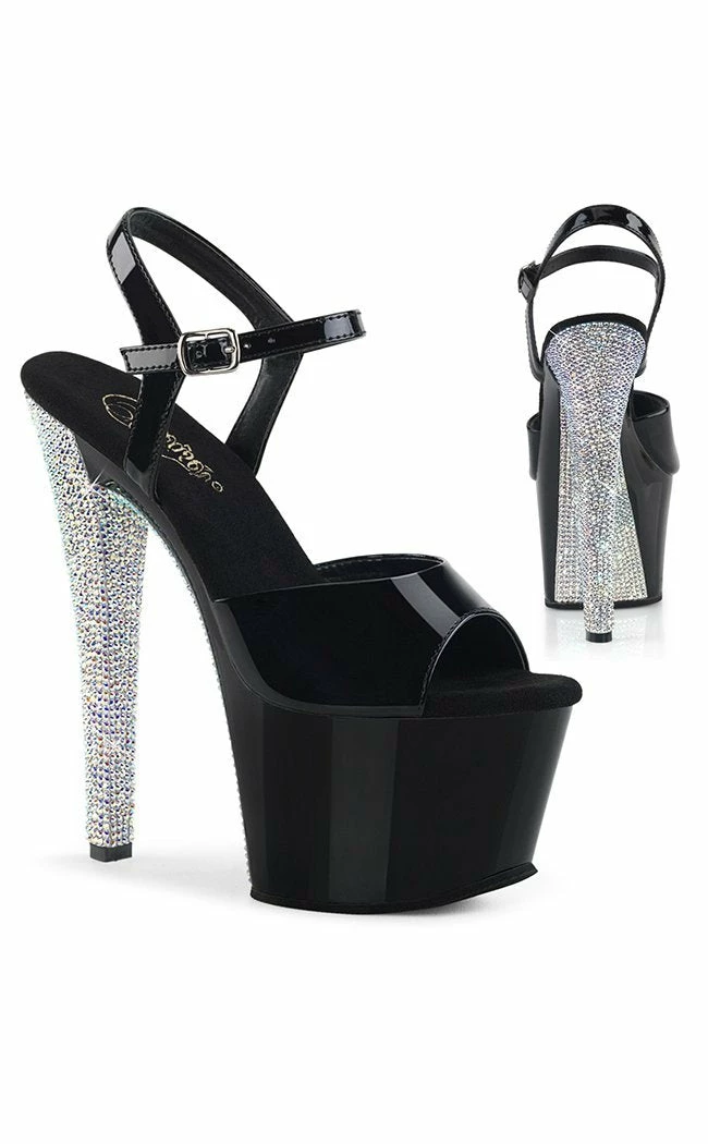 7″ (178mm) heel, 2 3/4″ (70mm) platform ankle strap sandal w/ contrast rhinestones on the heel & platform bottom