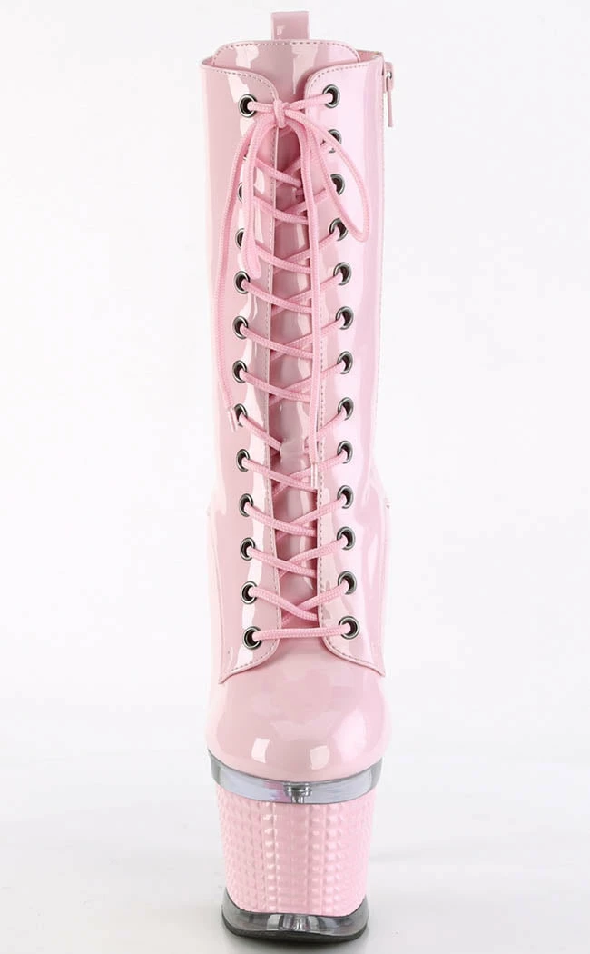 You’re a one-woman show, baby!Β The SPECTATOR-1040 ankle boots feature a veganΒ baby pink patent upper that secures with a lace-upΒ and side zip.Β The heel and platform are topped byΒ a clear panel above aΒ 3D stud look wrapping.