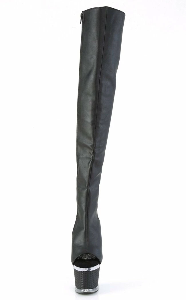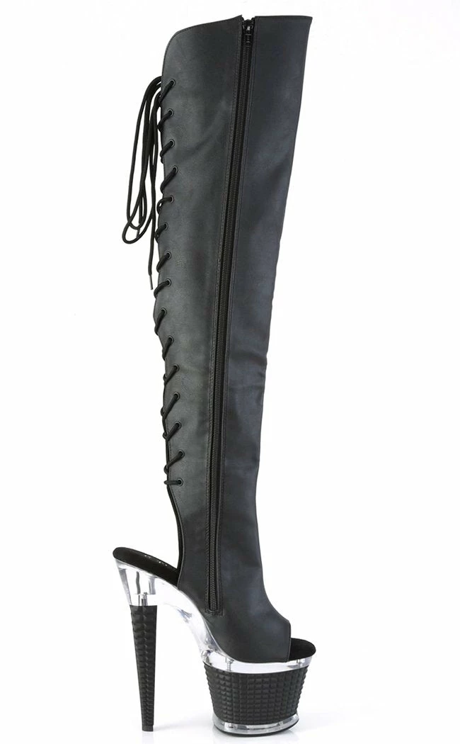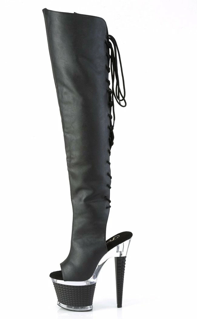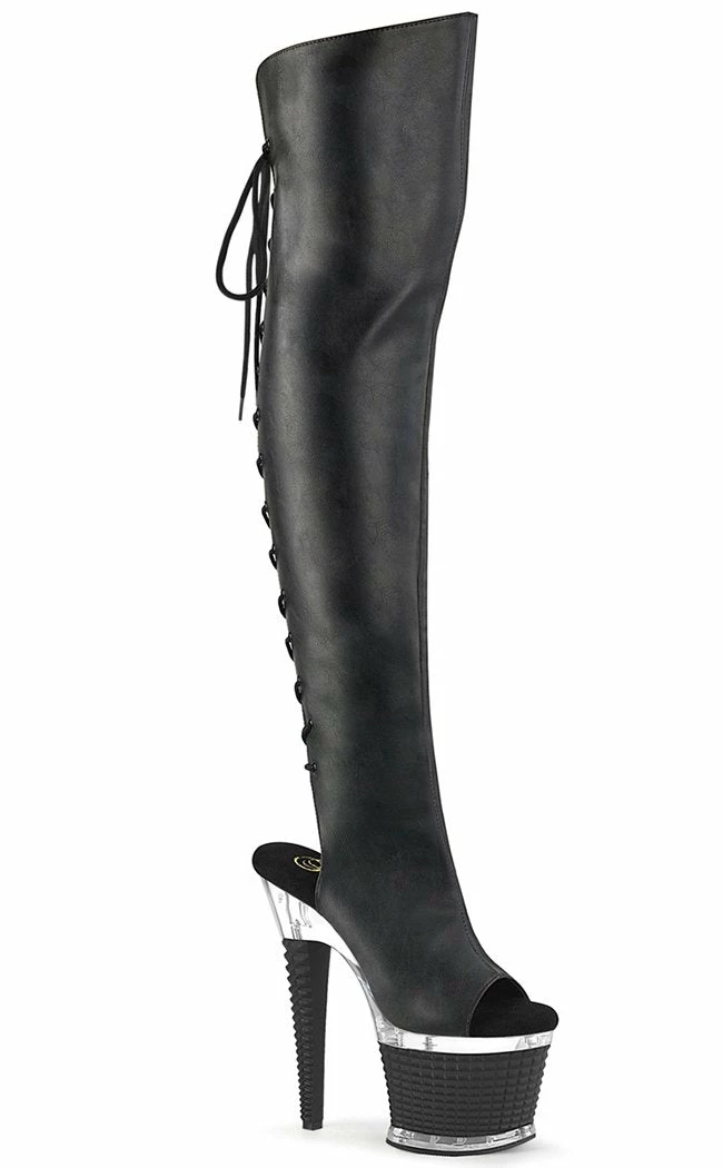 You’re a one-woman show, baby! The SPECTATOR-3019 thigh-high boots feature a black matte upper with a peep toe and ankle cutout that secures with a rear lace-up and inner zip. The platform and heel feature a clear segment on top of a stud effect panel.