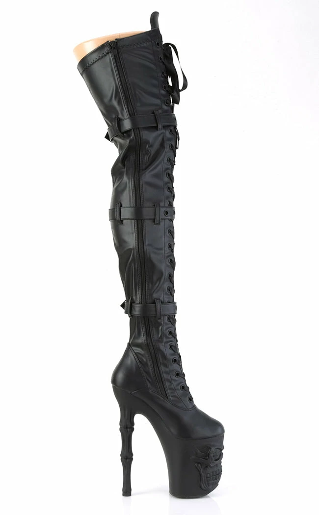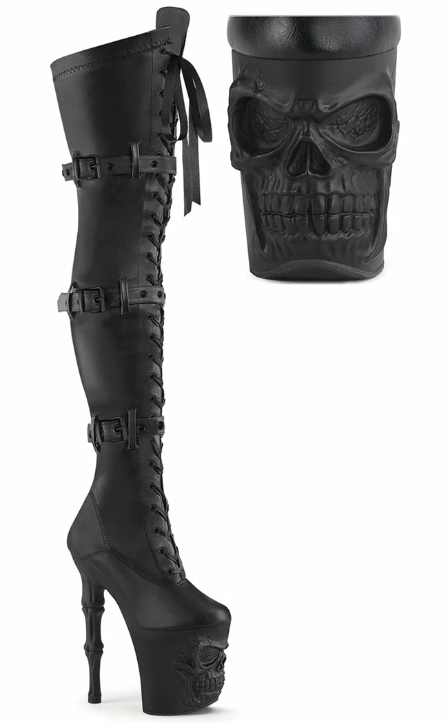 Reap with yer feetΒ in the RAPTURE-3028Β boots! These sexy af thigh-high boots feature a blackΒ matte upper that secures withΒ lace-ups, 3 buckled strapsΒ and aΒ full-length inner zip.Β The platforms are the real showstopper, featuring a grinning skull and fingerbone heel in aΒ matte black finish.