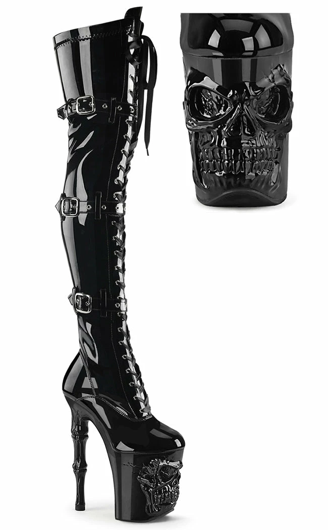Become yer own reaper in the RAPTURE-3028 boots! These boots feature a black stretch upper that secures with a lace-up panel and inner zip.Β The platforms are the real showstopper, featuring a grinning skull and fingerbone heel in aΒ glossy black finish.