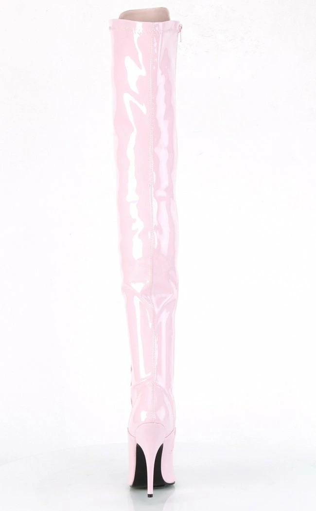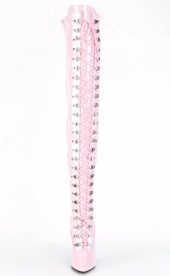 These thigh highs are a shiny, seductive baby pink with a 5″ (127mm) stiletto heel.Β The boots lace up and close with an inner zip.