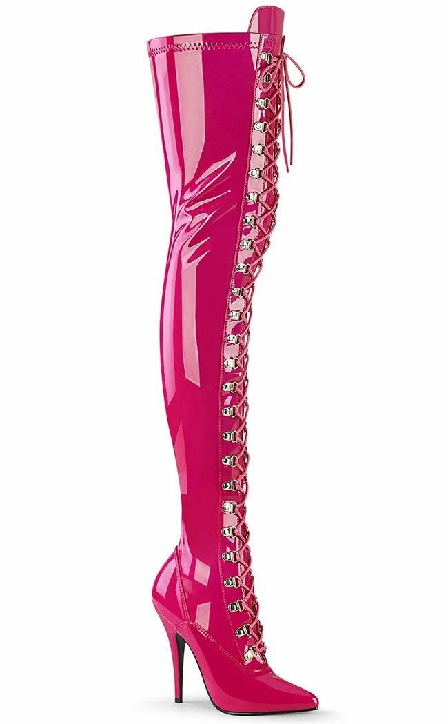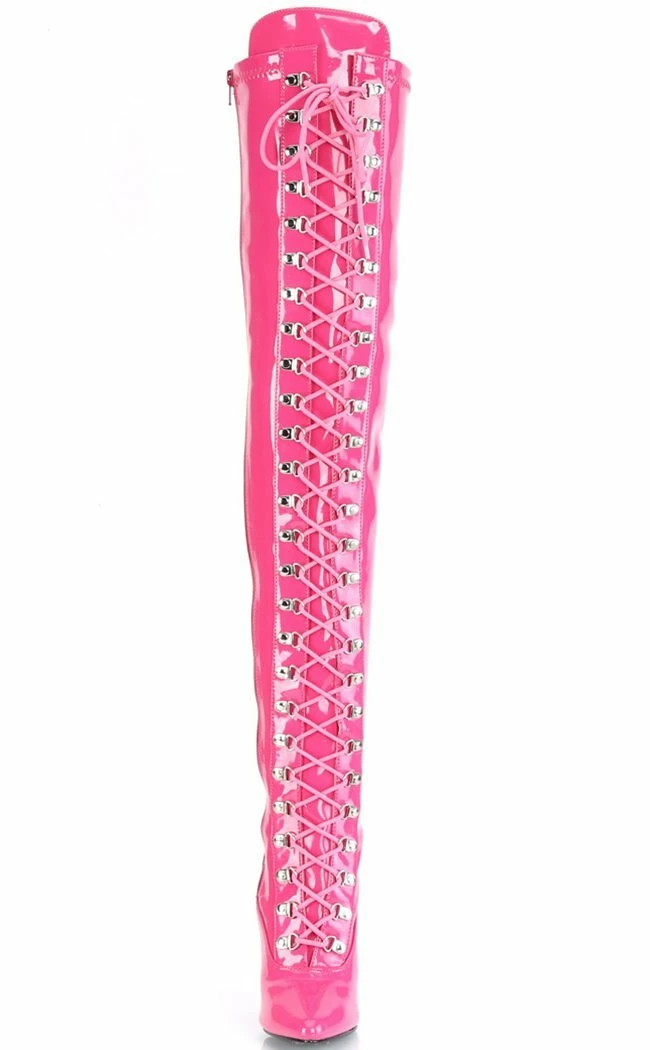 These thigh highs are a shiny, seductive hot pink with a 5″ (127mm) stiletto heel.Β The boots lace up and close with an inner zip.