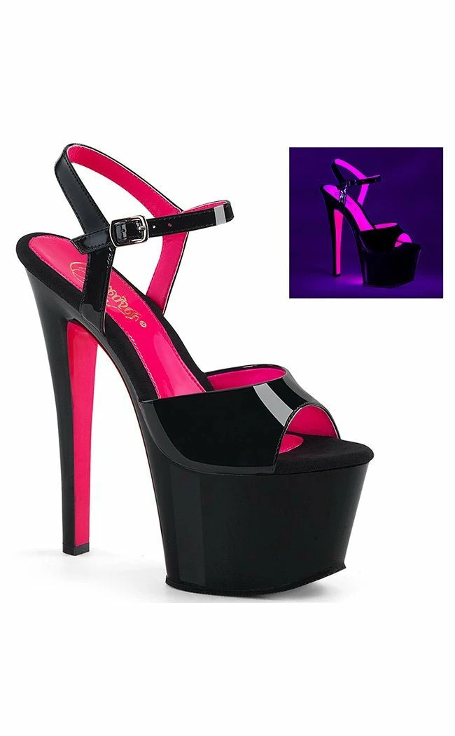 Black patent ankle-strap pole-dancing shoesΒ with an elegant 7-inch stiletto heel and 2 3/4-inchΒ shiny platform with a blacklight-reactive neon pink underside.