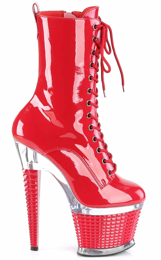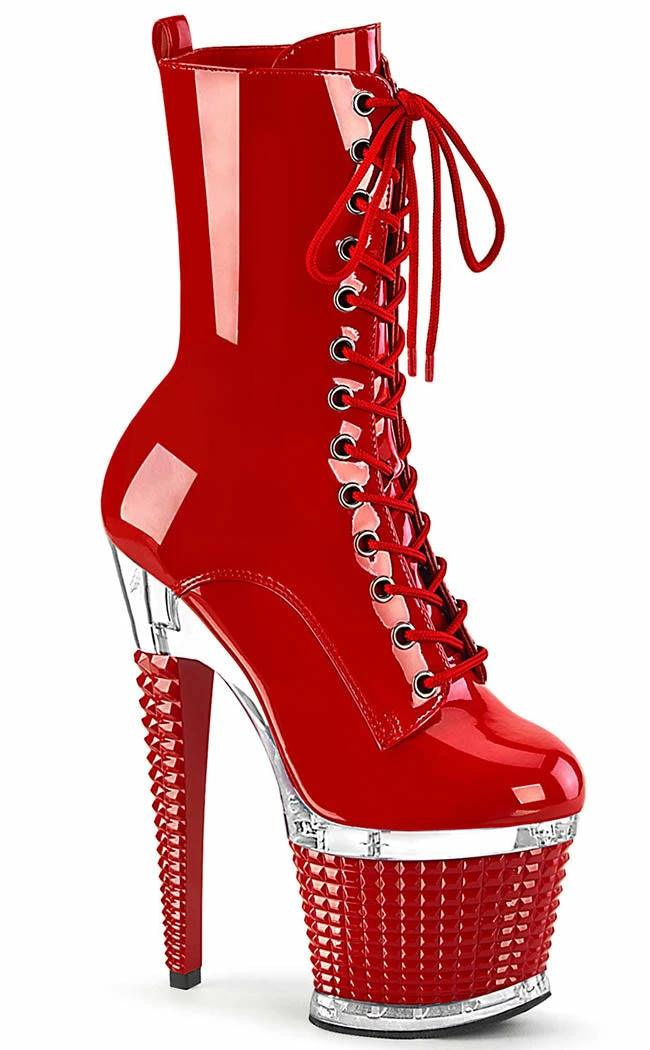 You’re a one-woman show, baby!Β The SPECTATOR-1040 ankle boots feature a veganΒ red patent upper that secure with a lace-upΒ and side zip.Β The heel and platform are topped byΒ a clear panel above aΒ 3D stud look wrapping.