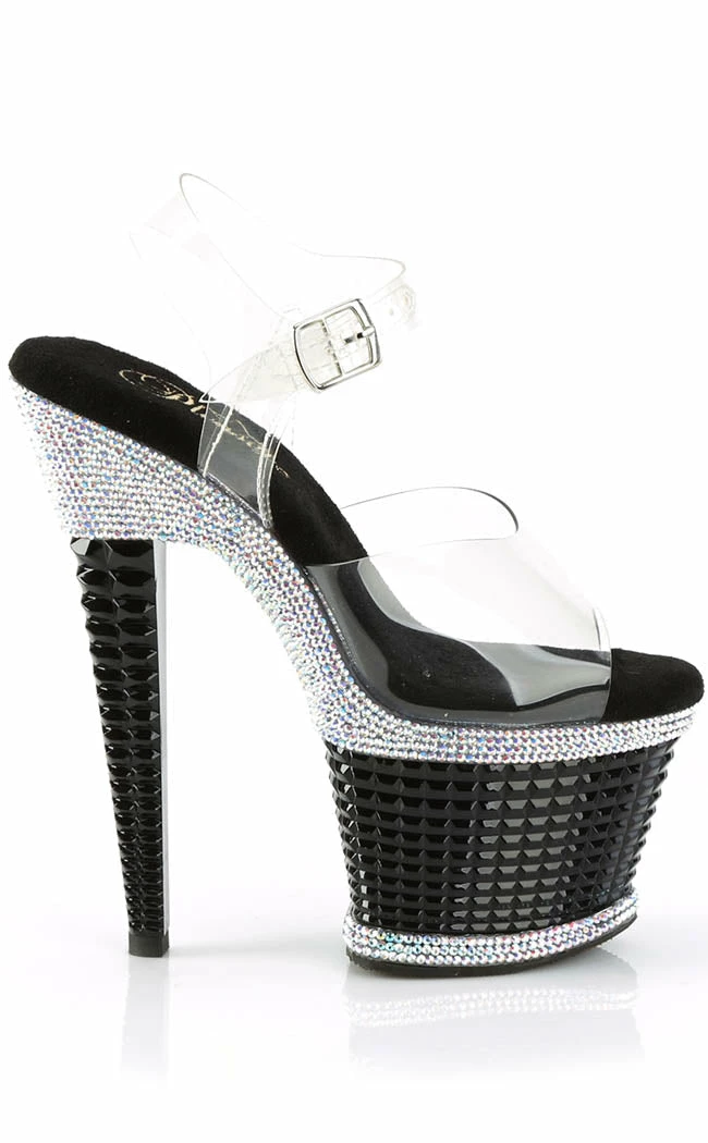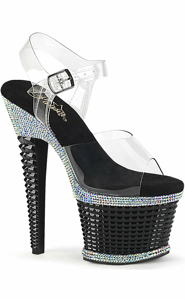 You’re a one-woman show, baby!Β The SPECTATOR-708 platforms are a sandal style heel with a peep toe and buckled ankle strap.Β The heel and platform are topped byΒ a clear panel above aΒ 3D stud look wrapping.