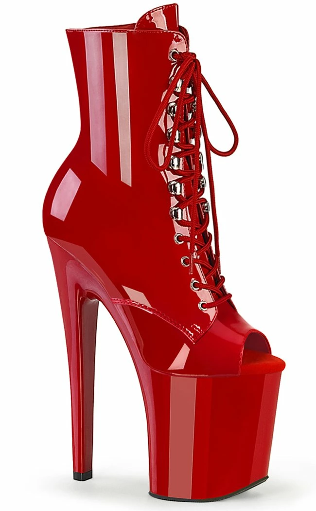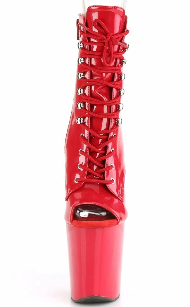 Take platforms to the xtreme!Β These peeptoe booties have an 8″ (200mm) spike heel and a 4″ (100mm) platform.Β Β The upper is a vegan patent red that laces up and secures with an inner zip.