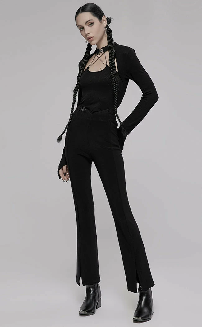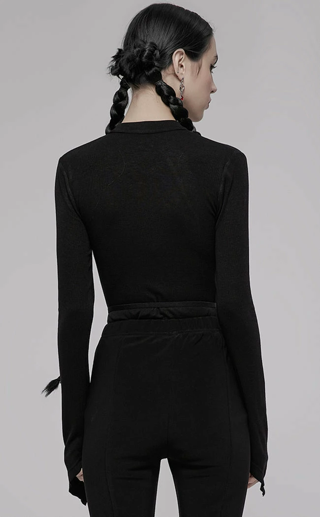 Ooze witchy woman vibes in the Alyx Top! AΒ choker neckline creates the illusion of a bolero, connecting toΒ long, pointedΒ sleeves andΒ forming a bare yoke. The cami neckline connects to the choker with removable gunmetal chains that form a pseudo pentagram, summoning extra drama points for any look.