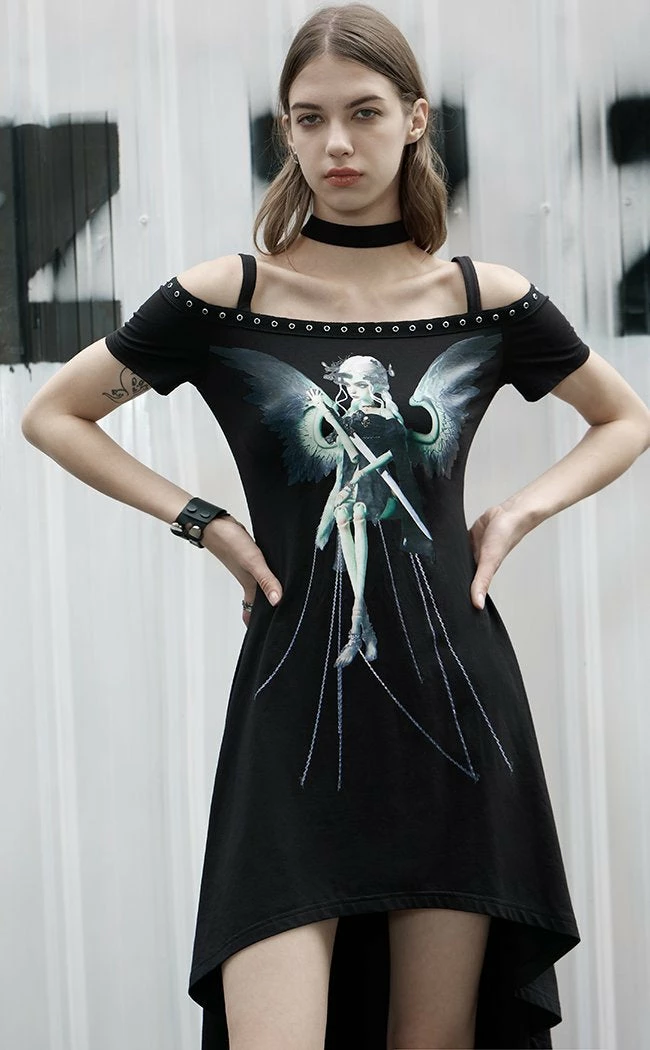 The collar of this dress is adjustable so it can sit comfortably above the cold shoulder trimmed in badass rivets.Β Two shoulder straps keep everything secure (and totally hide that bra!)Β The front is printed with artwork of a beautiful angel who may not be as chaste as she appears.