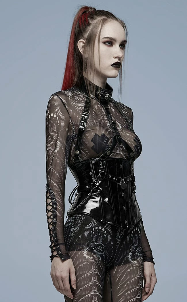 Look devilishly good in the Ain’t Slick Patent Corset! Luxury vegan leatherΒ shapes to yer bod, securing with a classic fastener and fully adjustable thanks to the rear lacing. A halter harness amps up the sexy along with extra deets like a heart buckle, studs and a skull charm on the collar. The whole chest loop can be removed if the mood takes ya.