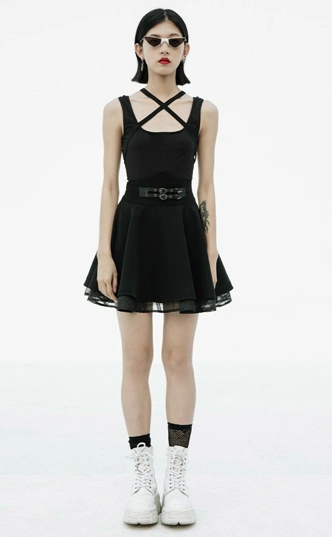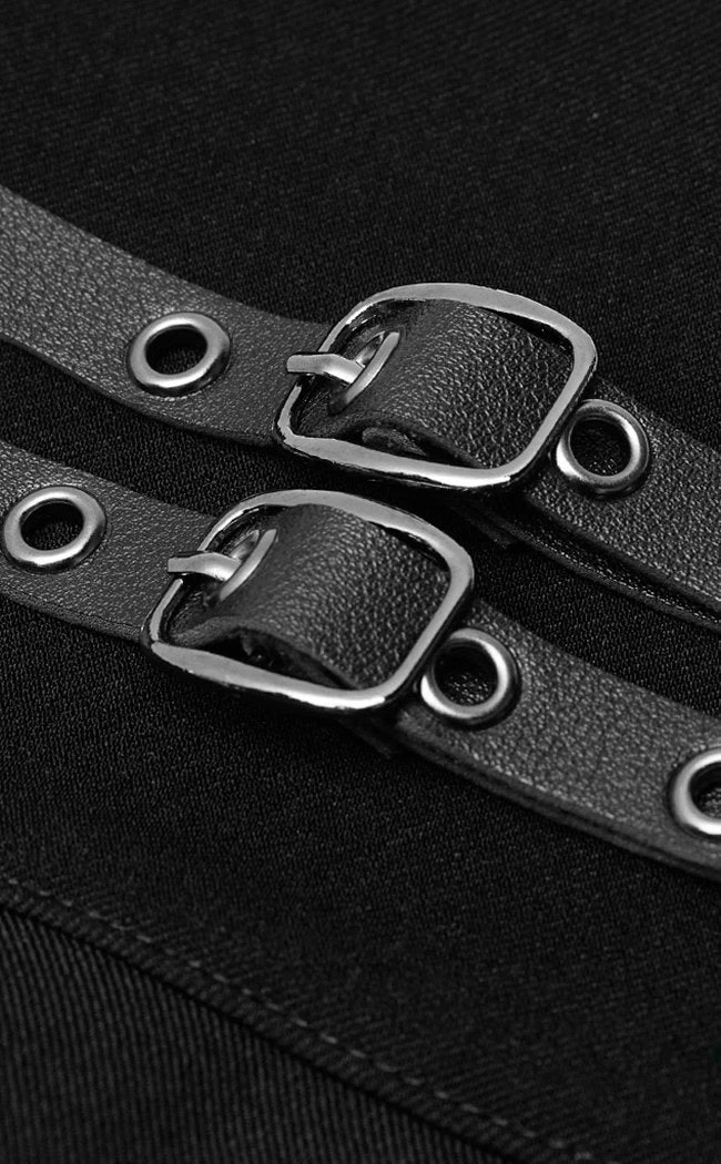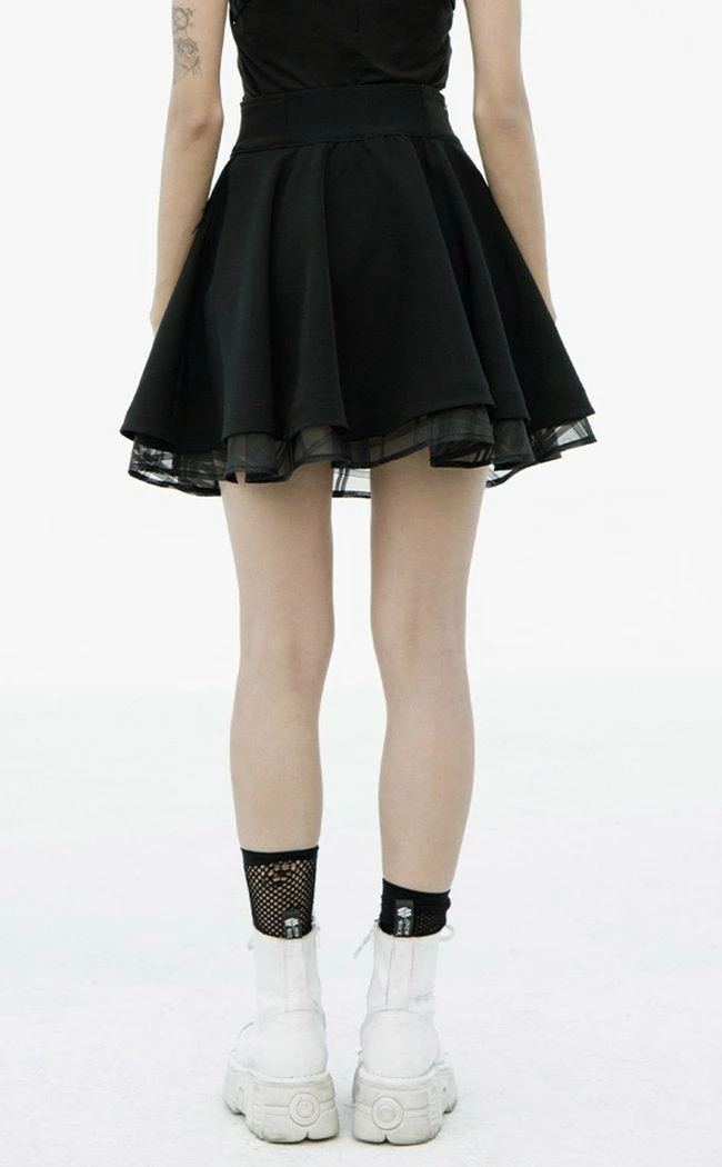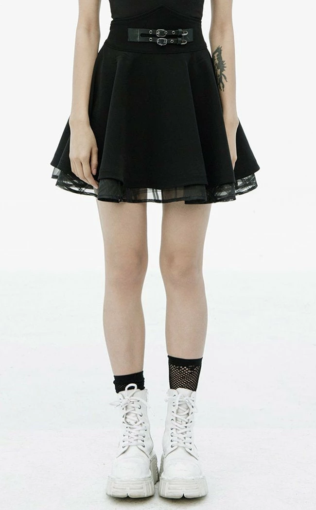 Now here’s a skirt with bounce!Β Β Β The outer black skirt sits over a trim of unique, grey organza-comfortably lined for that elegant punky feel.Β The waist comes to a point at the fron for maxxx vampy points and is topped of with a double belt decal.