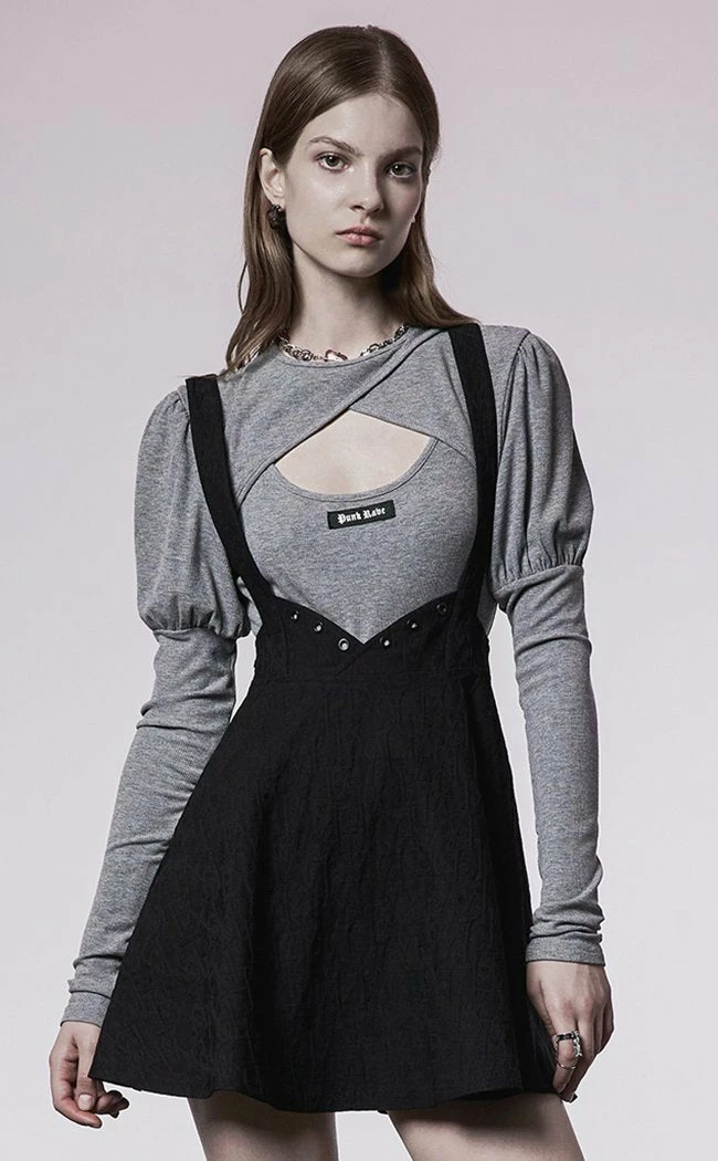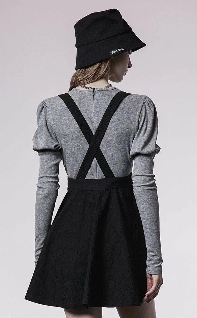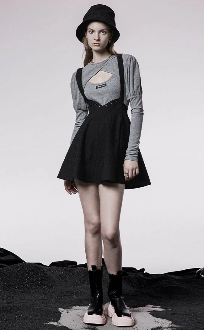Look cute n sharp af in the Harriet Suspender Skirt! The waistband features eyelets and curving angles, looking a little like cat ears to create flattering lines before flaring out into a mini skirt. The suspender straps are thick and adjustable, crossing over at the back. The fabric is textured to keep things interesting in black on black outfits.