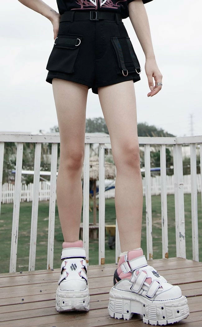 These shorts feature a weave that’s soft on the skin but hardy to withstand whatever life throws in. The high waist is fitted with a tactical belt and matching strap decals all kitted out with D rings so you can attach straps n chains. The pockets are super practical and fitted with contrasting mesh to create a cool texture.Â