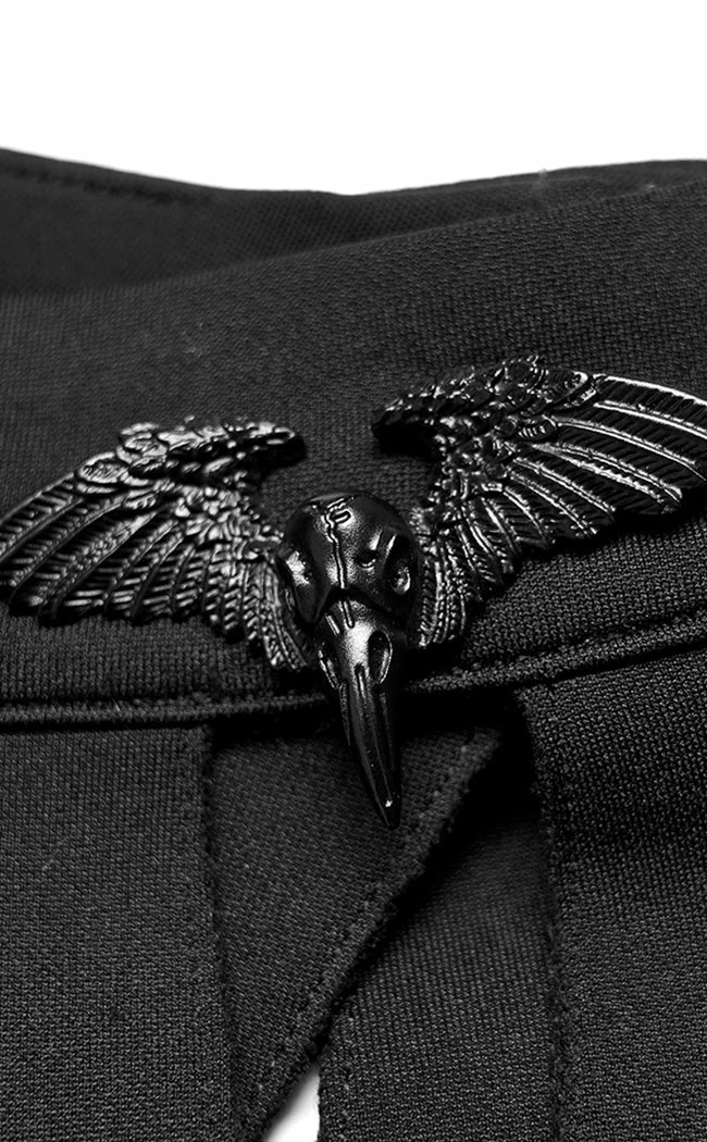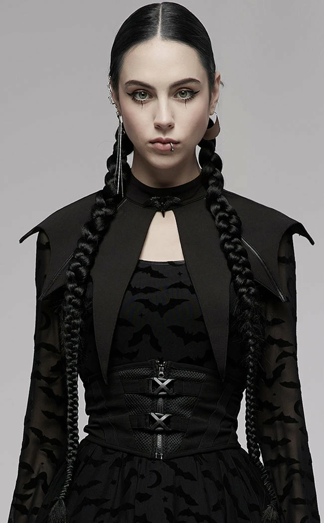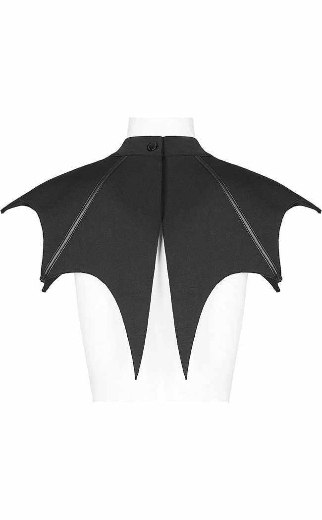 Get ready to take the night in the Lucretia Batwing Collar!Β This collar fastens with a button at the neck, two wings spreading over the shoulders and across the back in an evil sailor style. A detachable winged raven skull pin sits at the neck for an extra touch of gothic horror.