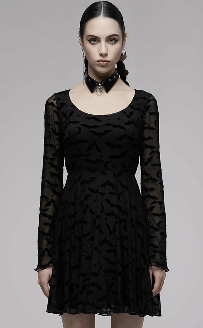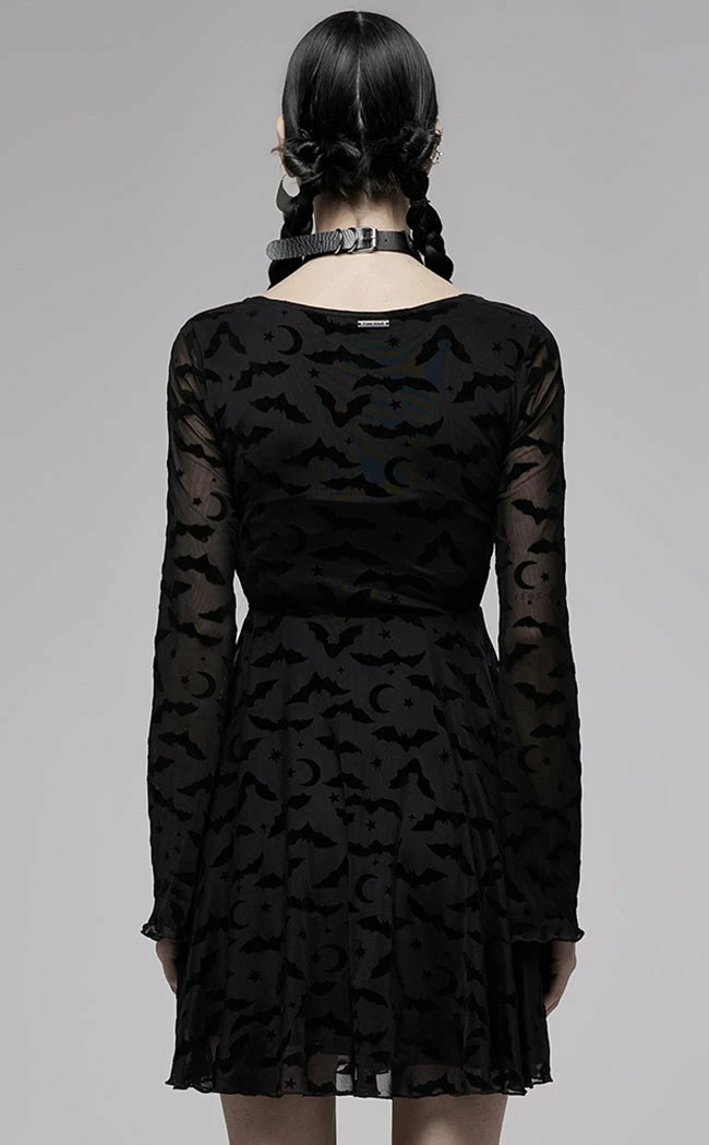 Turn the vampire vibes up to 11 in the Mina Flocked Dress! An outer layer of mesh is flocked with a pattern of bats, moons and stars, which forms long, wide sleeves for a touch of drama. The body features an opaque lining, forming a round neckline, fitted waist and skater skirt.