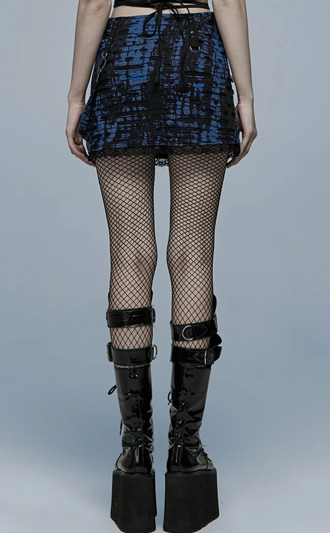 The Minuit Mini Skirt features a decadent blue/black fabric that stretches with you, decked out with statement strap details, D rings, a removable bondage strap, eyelets and lace trims to add an elegant touch to yer punk edge.