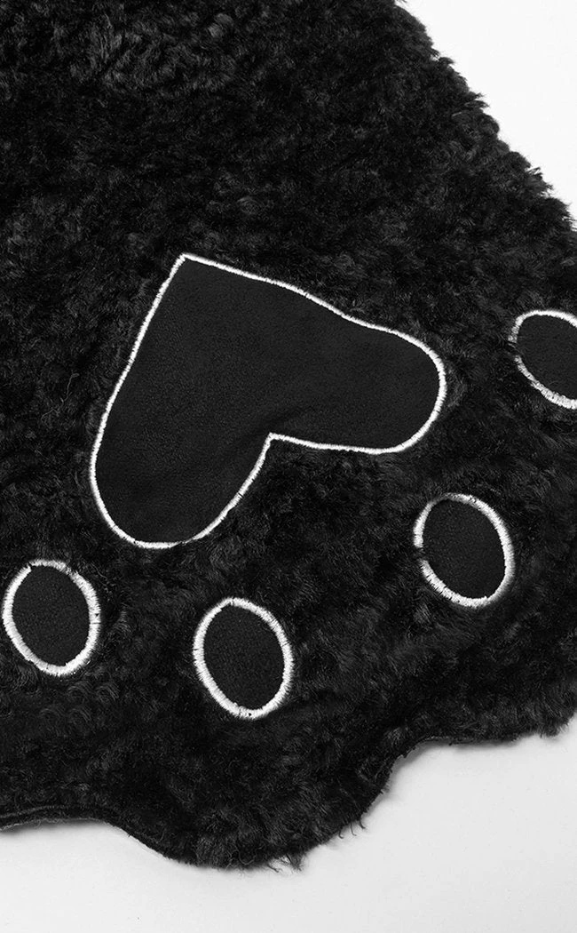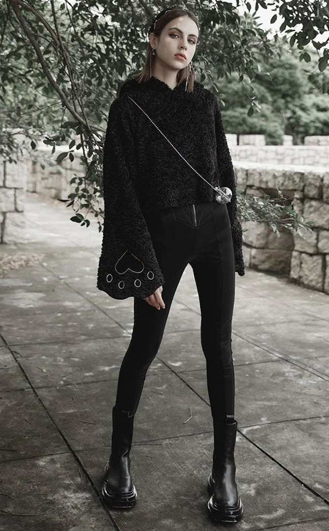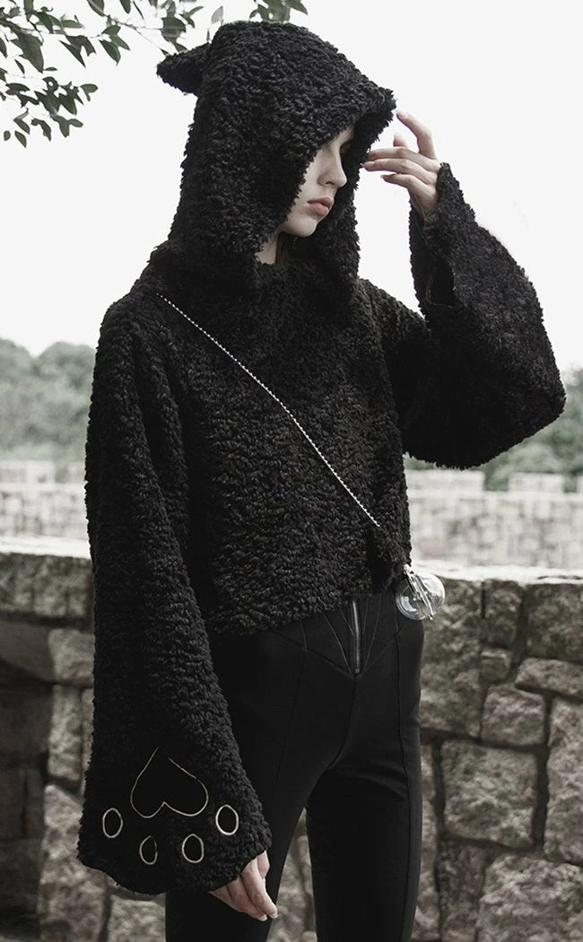 Hide away in darkness and fluff with the Night Creatures Pullover! Super soft fur wraps your bod in a loose, relaxed fit with an oversized, pointy hood.Β The sleeves flare slightly and end with heart-shaped paws. So cute!