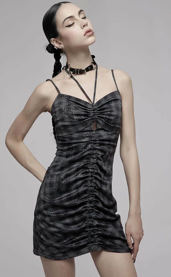 Worship yer curves in the Velika Bodycon Dress! Soft stretch fabric hugs yer bod, forming a ruched effect that creates a flattering centre line and a small cutout at the chest. The tartan stands out from the flock with a pattern of cherubs fluttering around. The drawstring can be tied at the neck as a halter or alongside the shoulder straps.