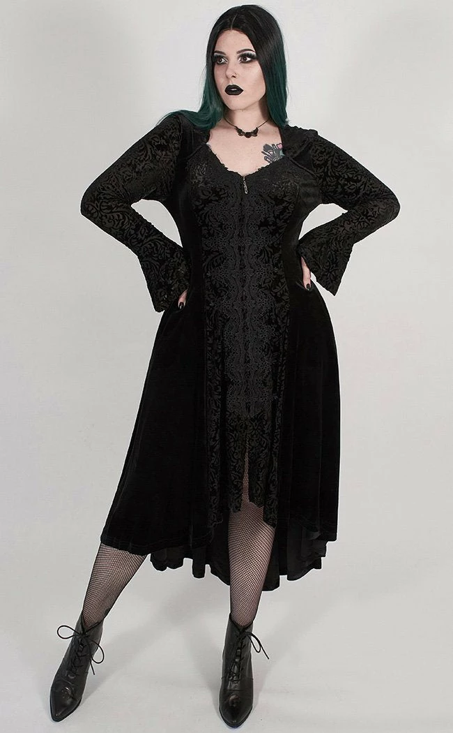 Stay warm with this beautiful cut of burnout velvet!Β The front zips for easy on/off with a beautiful charm pull, surrounded by intricate applique.Β The hood drapes prettily over the head and the hem is asymmetrical to create the illusion of walking through shadow.