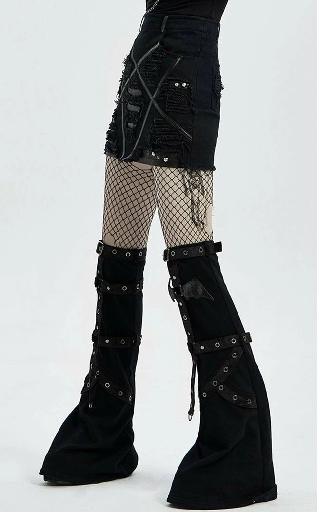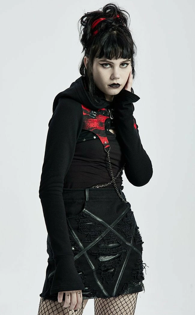 Get raw in the Enmity Denim Mini Skirt.Β The denim is shredded, featuring ragged edges and an inverted pentagram made of faux leather that cuts into the fabric.Β Extra details like studs and a final badass touch.Β