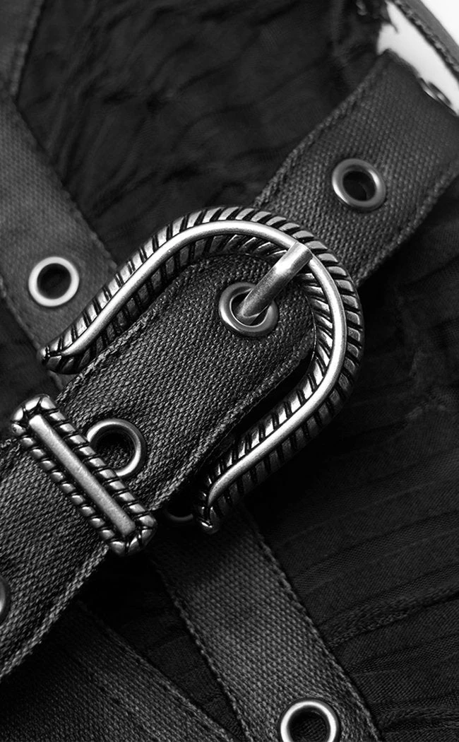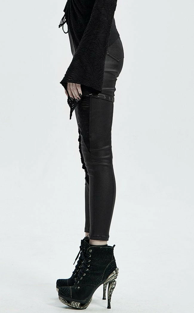 Strap in with these sleek af leggings!Β Eyelets run down the left leg to match the buckle strap decals and corseting, creating flattering lines and an industrial vibe.Β The faux leather is super stretchy to flatter all yer curves.