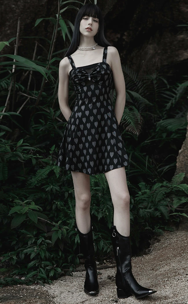 Serve perky with a side of gloom in the Forbidden Fling Mini Dress! This A-line dress is formed from a jacquard heart fabric, creating a monochrome motif of hearts against a pitch-black background. Thick shoulder straps lead to a statement neckline featuring a gathered bow-look chest secured with a faux leather tie sitting over a mesh panel.