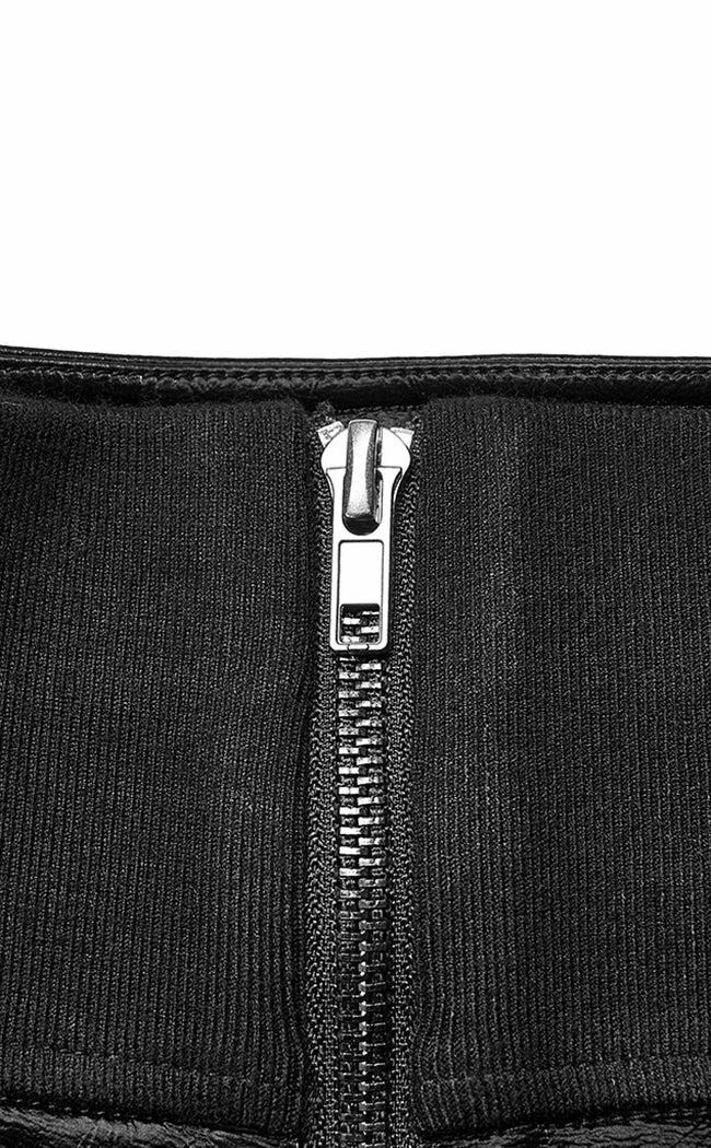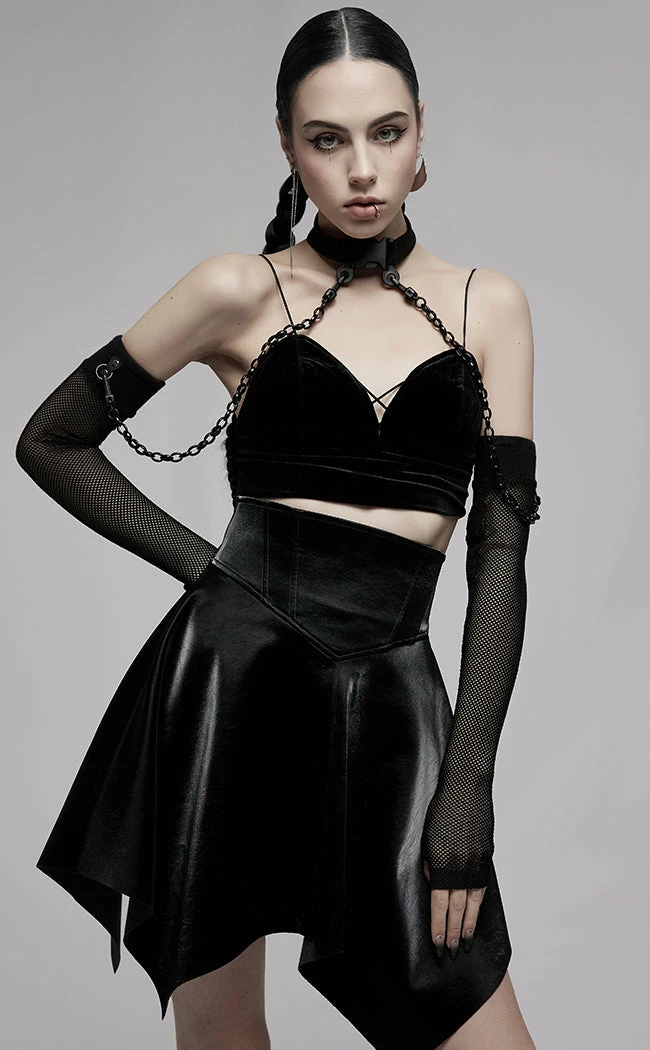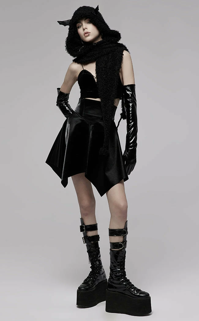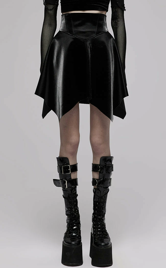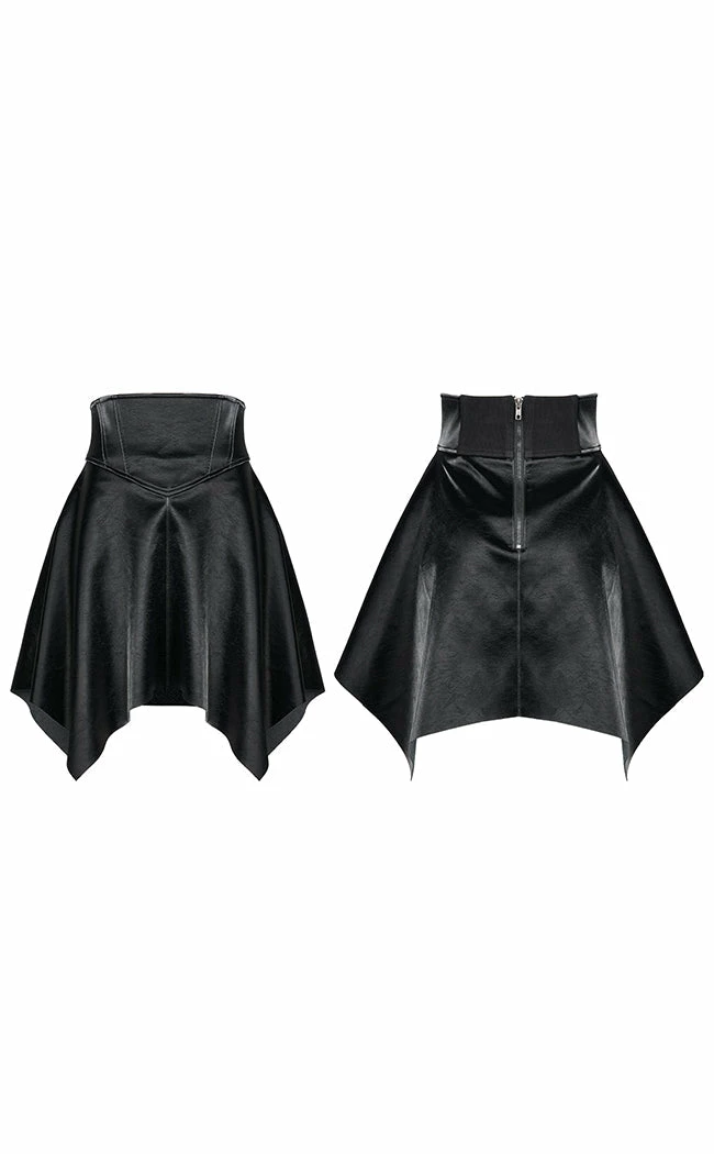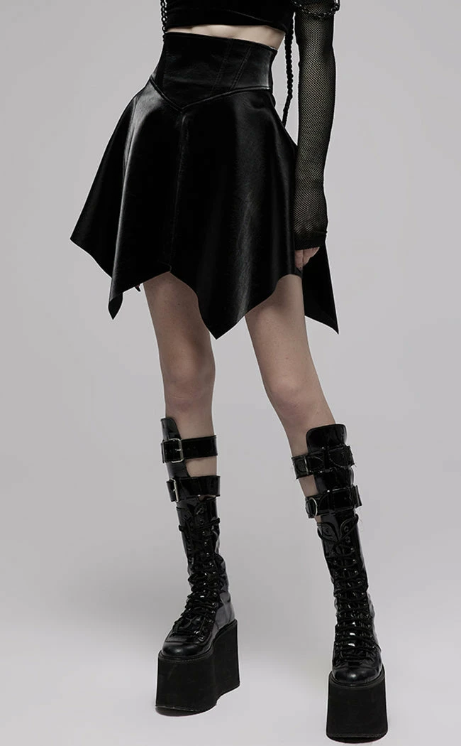 Harness your inner strength in the Fortress Mini Skirt! Made from a shimmering faux leather fabric, this mini sits high on the waist and flares out into a hanky hem for maximum witchy vibes. The waist is elastic to stretch for the perfect comfort fit and secures with a rear zip for easy on/off.