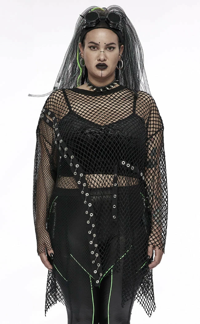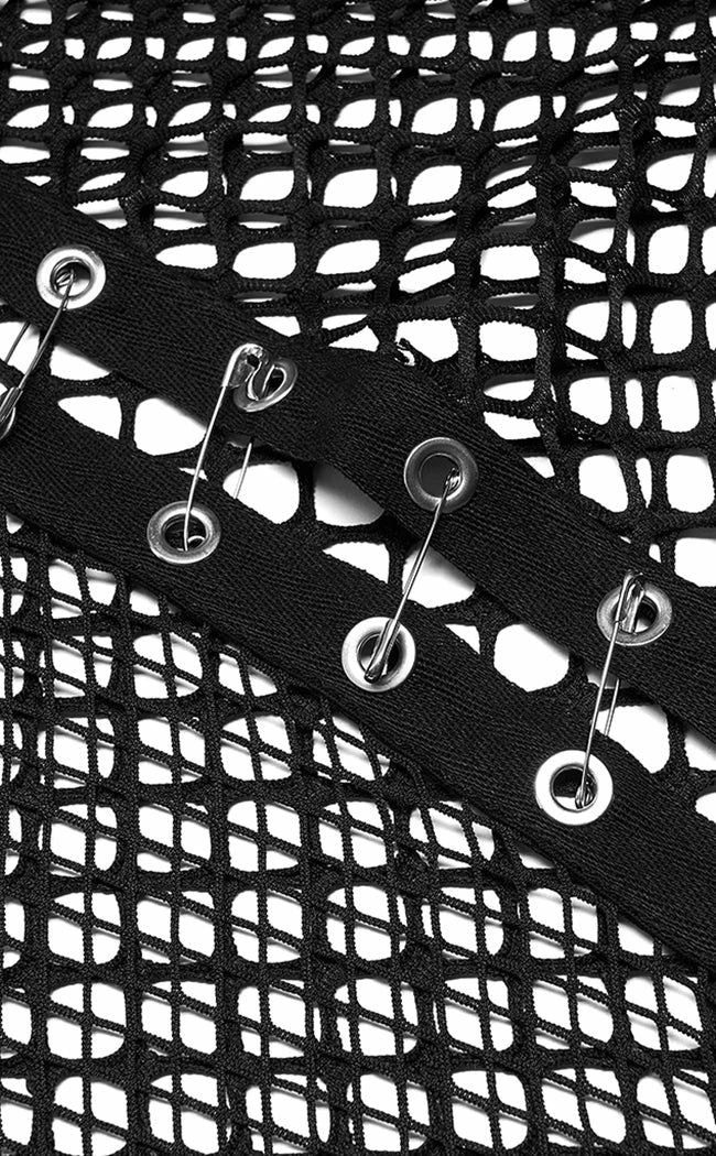 Prepare for the cyber apocalypse in the Glitchcore Mesh Top! This relaxed fit top is made of a wide net that forms long sleeves and a tattered, asymmetrical hem. Eyelet straps cut lines to break up the mesh with one long strap connecting with safety pins for a punk af finish.