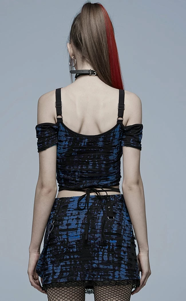 Step out of the shadows in the Minuit Bardot Crop! Deep blueΒ and black shredded fabric is cut into a flattering crop, featuring a bardot neckline made with a badass harness. With extra deets like lace trims, D rings and a waist tie this baby can be dressed up or down for dystopian chic any day of the week!