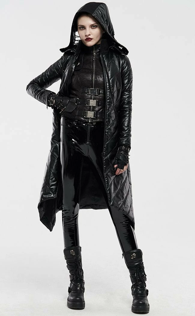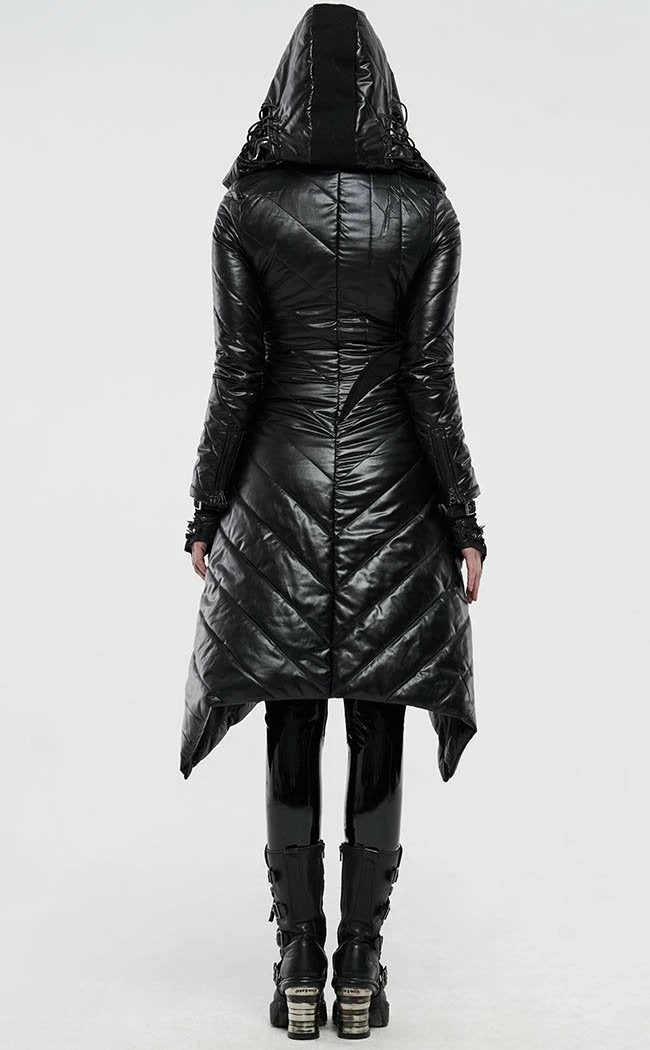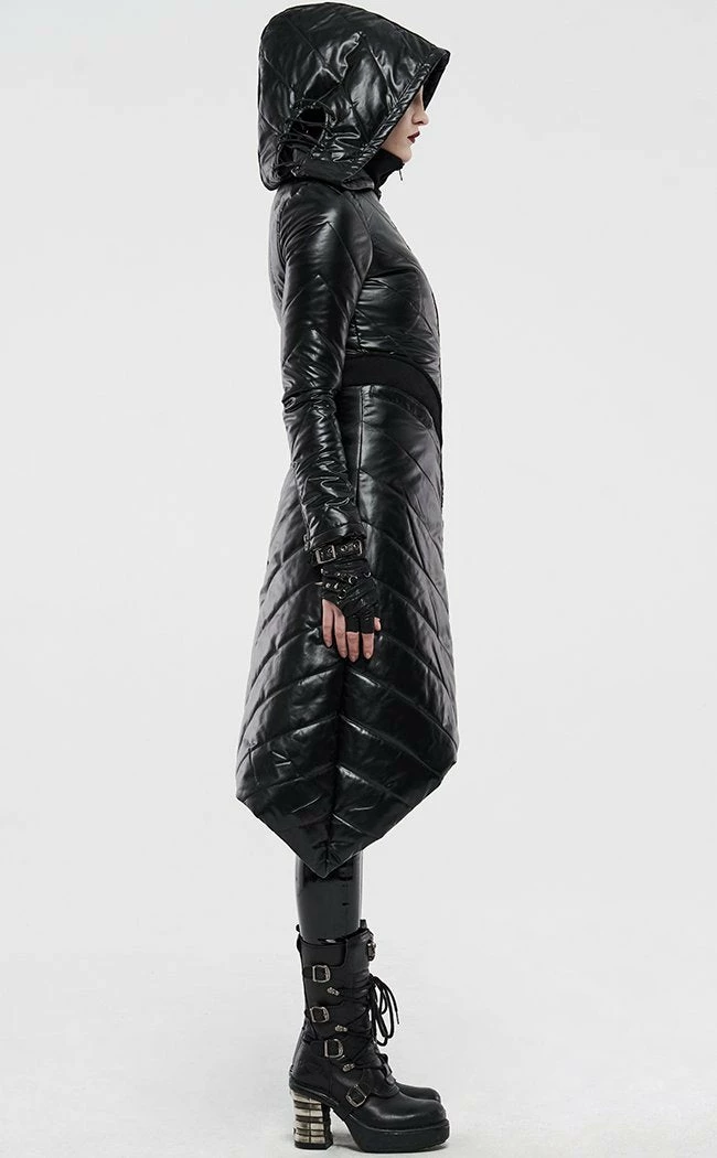 Stitched into geometric patterning, this puffy coat has a large, draping hood to create an air of mystery while the hem ends in a futuristic asymmetrical cut. Wear over leggings and stompy boots to prowl the streets.