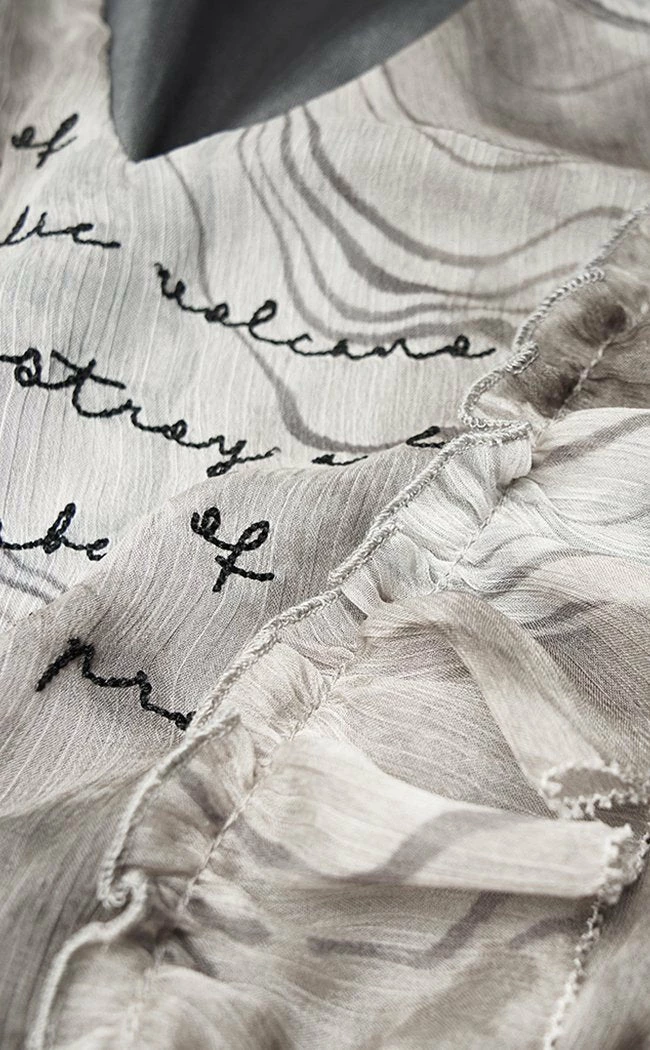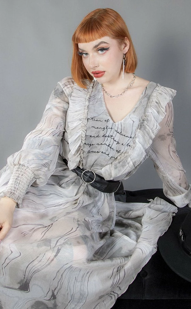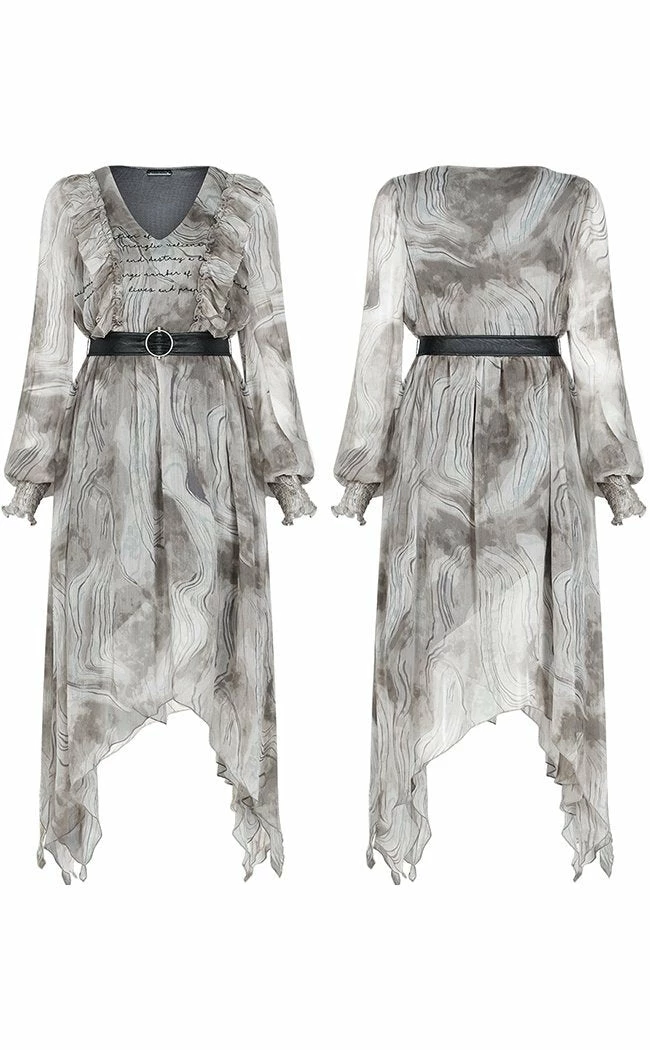 This beautiful dress of smoke and mists is made of flowing, soft chiffon that drapes flatteringly over the figure.Β The deep V neckline sits above embroidered text and ruffles, the sleeves puffing to add to the flowing figure.Β The skirt is a midi, asymmetrical length that is cinched by the removable faux leather belt.