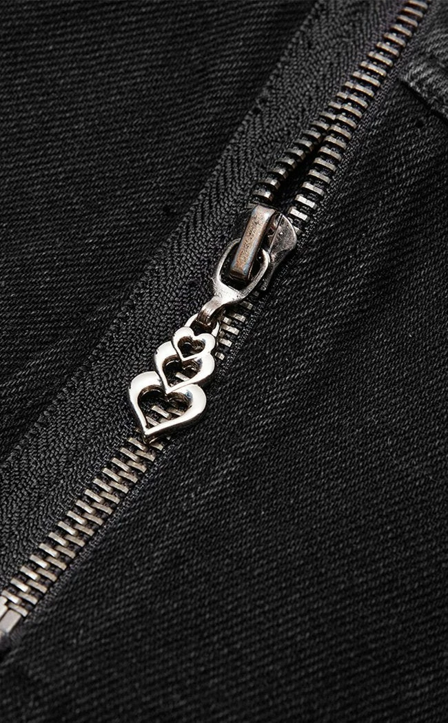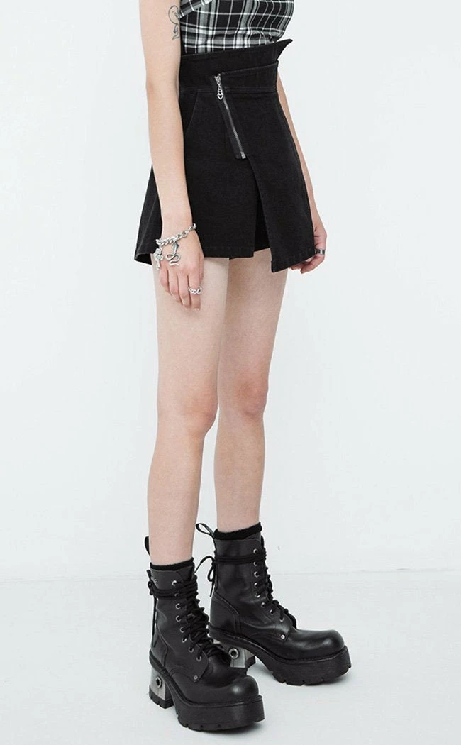 These shorts are all angles and no bull!Β The front panel zips at an angle to the side, deliberate cut in the hem complements the peeping panel at the waist.Β These babies are high waisted so they look amazing with crops, tanks n fishnets.